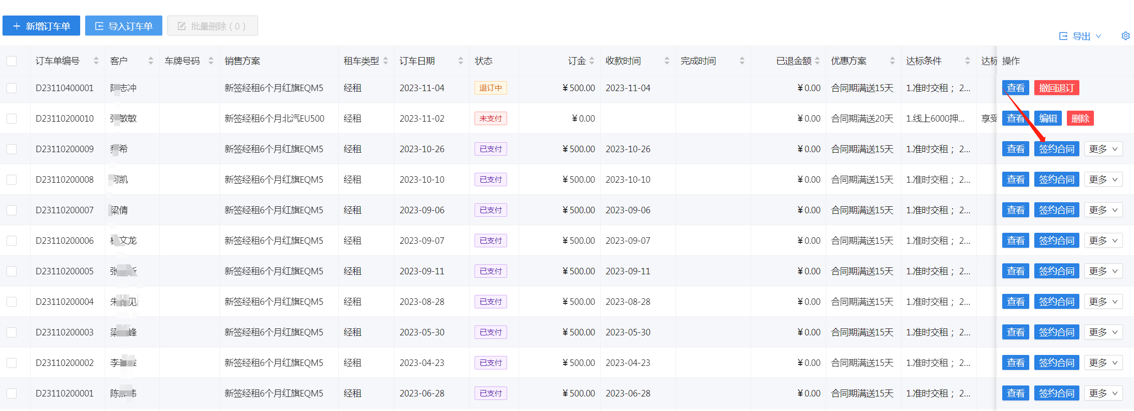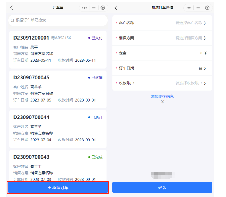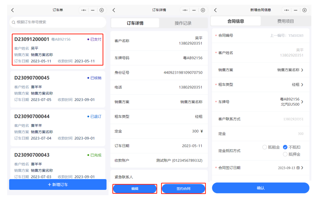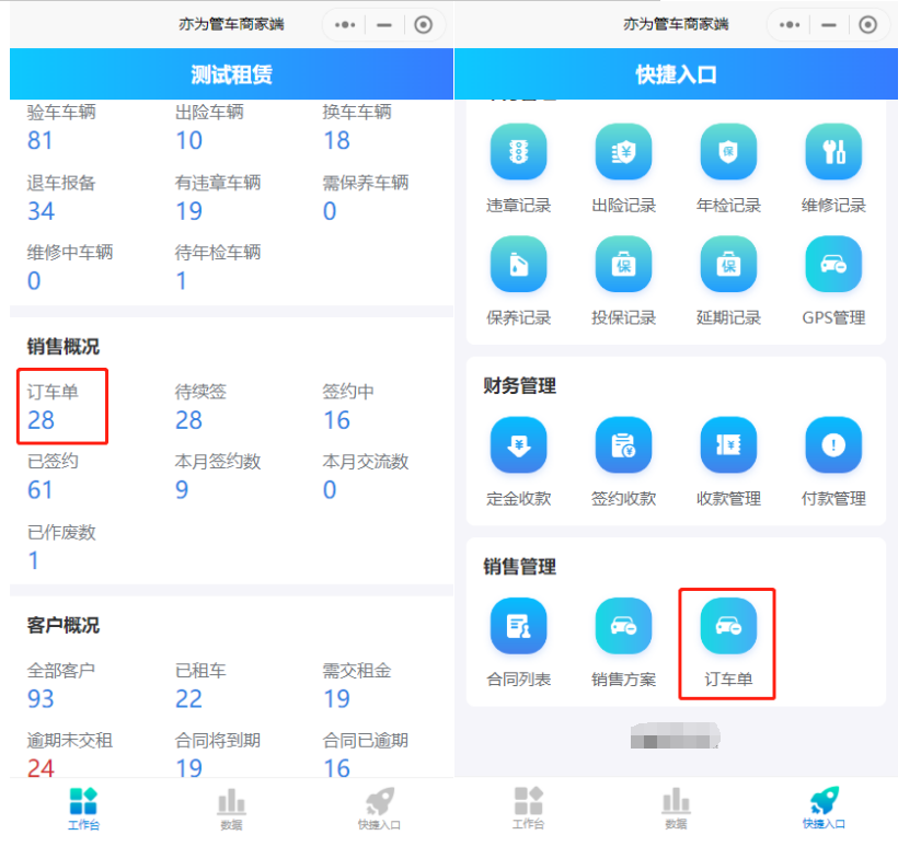 订车管理用于记录订车单及对订车单进行操作。支持选定车牌或下发订单后修改车牌。 (1)新增订车单,带"*"项目为必填  订车单生成后下一步为财务管理-订金收款,操作订金收款后订车单状态变更为已支付,如有选择车牌,则该辆车状态变更为已订。 (2)签约合同,点击订车单右边的签约合同,合同编号可用滴滴小桔合同编号,可关联支付记录。   签约后该订车单会变更为已完成,如定金未抵扣押金或租金,则旁边会显示退订申请。如一直未签约,可操作核销,表示没收订金。  建议所有操作先下发订车单再签约,这样可以统计合同签约率。 微信小程序可通过工作台的订车单或快捷方式的订车单进入订车管理。