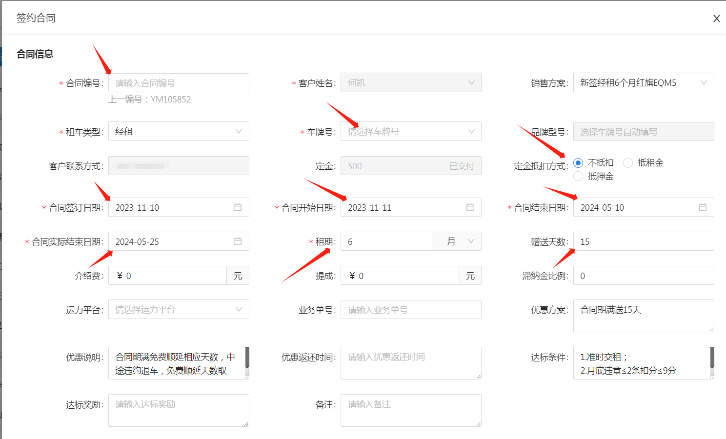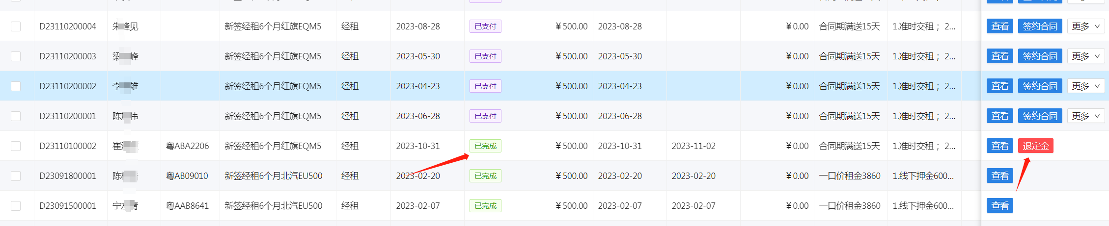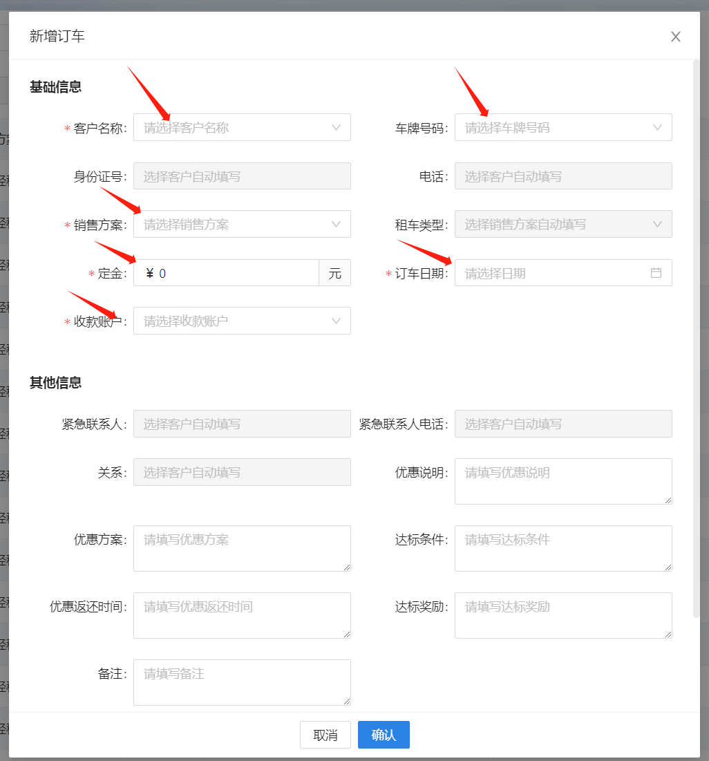 订车管理用于记录订车单及对订车单进行操作。支持选定车牌或下发订单后修改车牌。 (1)新增订车单,带"*"项目为必填  订车单生成后下一步为财务管理-订金收款,操作订金收款后订车单状态变更为已支付,如有选择车牌,则该辆车状态变更为已订。 (2)签约合同,点击订车单右边的签约合同,合同编号可用滴滴小桔合同编号,可关联支付记录。   签约后该订车单会变更为已完成,如定金未抵扣押金或租金,则旁边会显示退订申请。如一直未签约,可操作核销,表示没收订金。  建议所有操作先下发订车单再签约,这样可以统计合同签约率。 微信小程序可通过工作台的订车单或快捷方式的订车单进入订车管理。