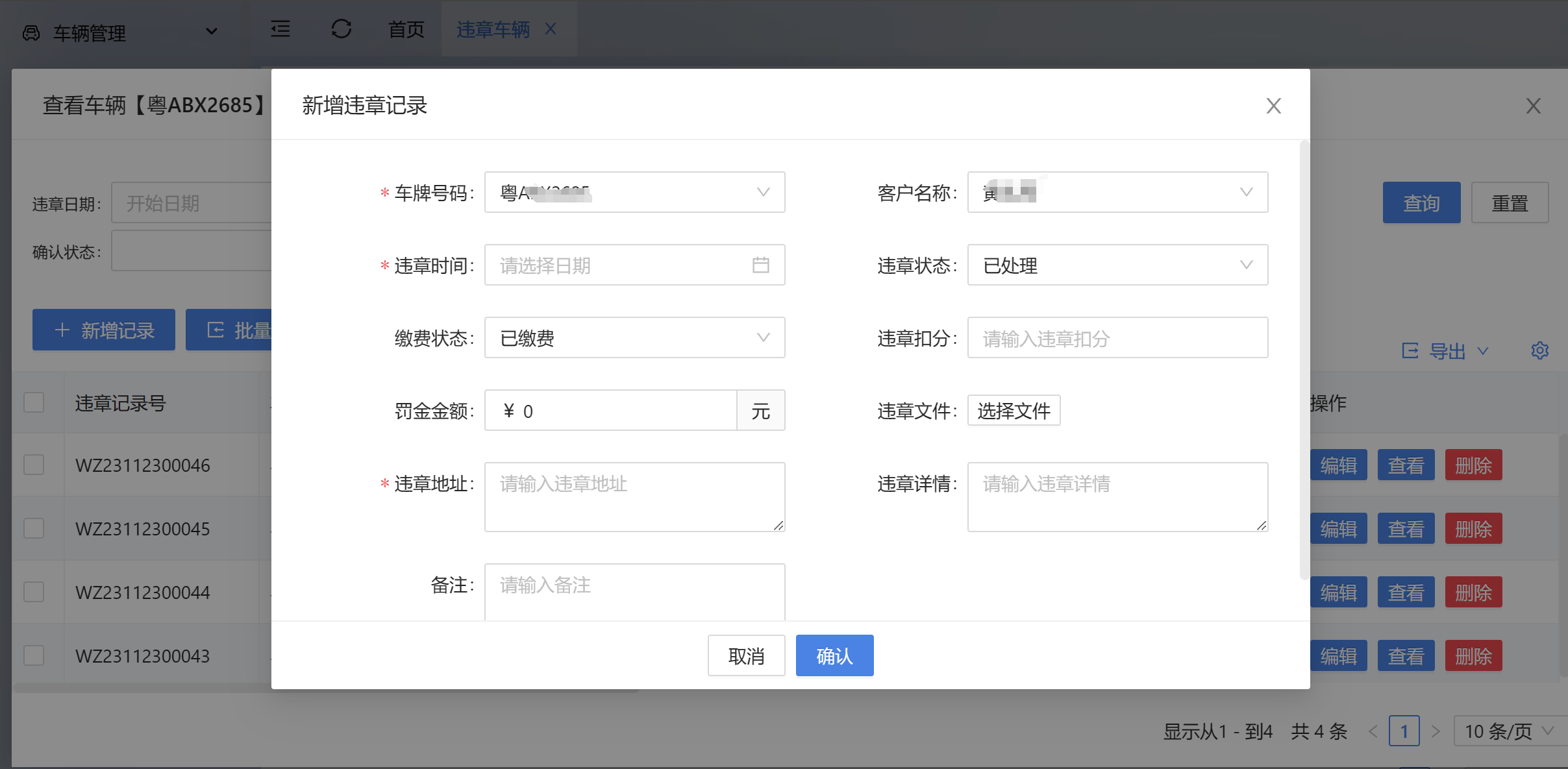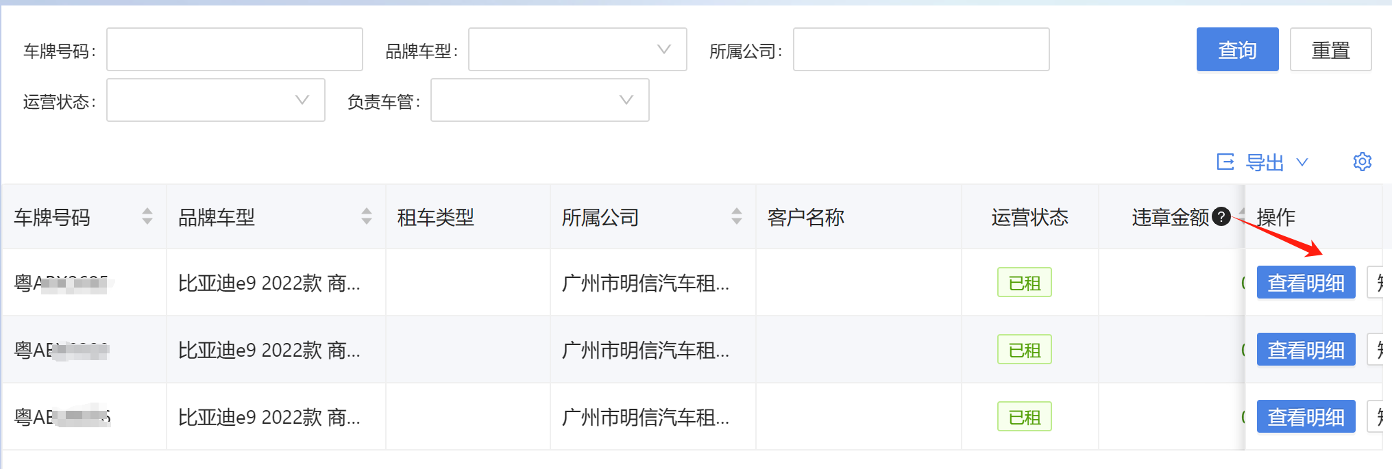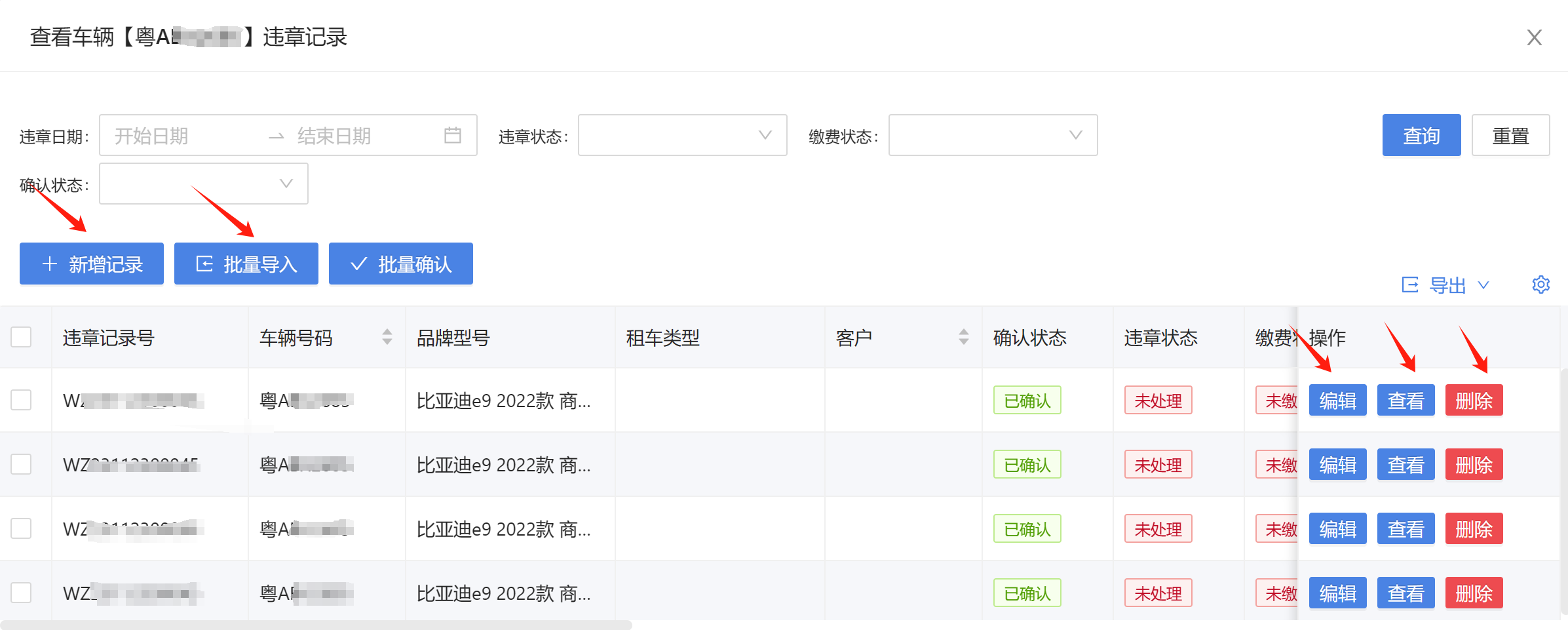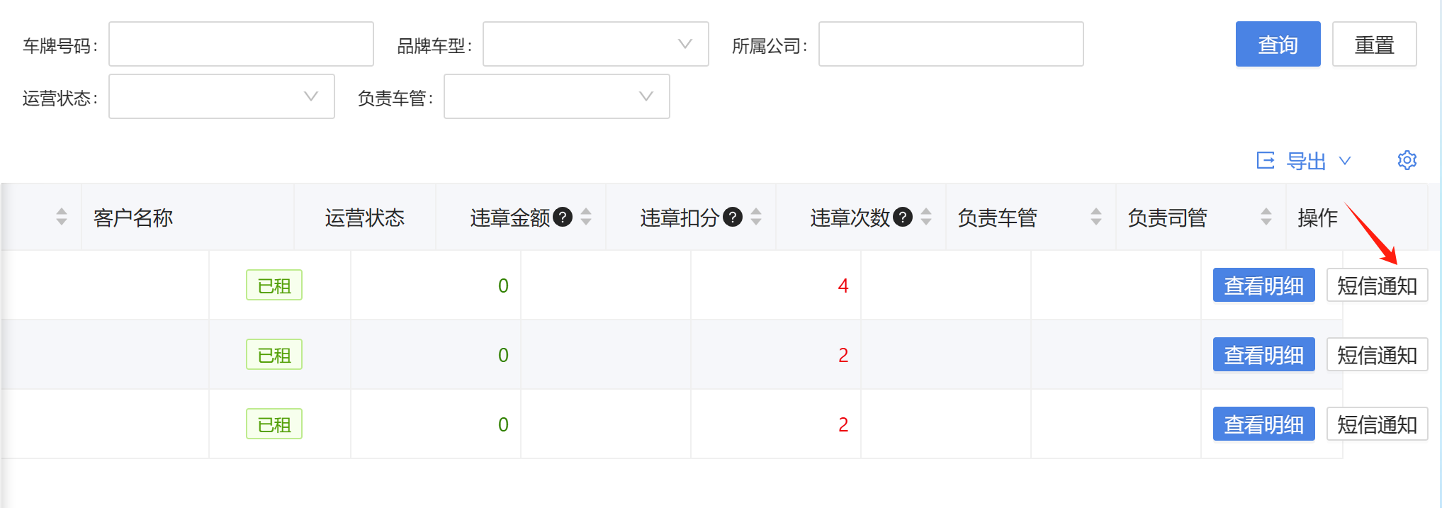 违章车辆模块用于对出现违章的车辆进行管理,支持查看/编辑/删除车辆的违章明细、为车辆新增违章记录和通过下载模板填写批量导入违章记录,以及为客户发送短信通知。  点击“查看明细”可通过筛选查询车辆的违章明细    微信小程序可以从快捷入口进入违章车辆对高风险违章车辆进行查看和操作。
