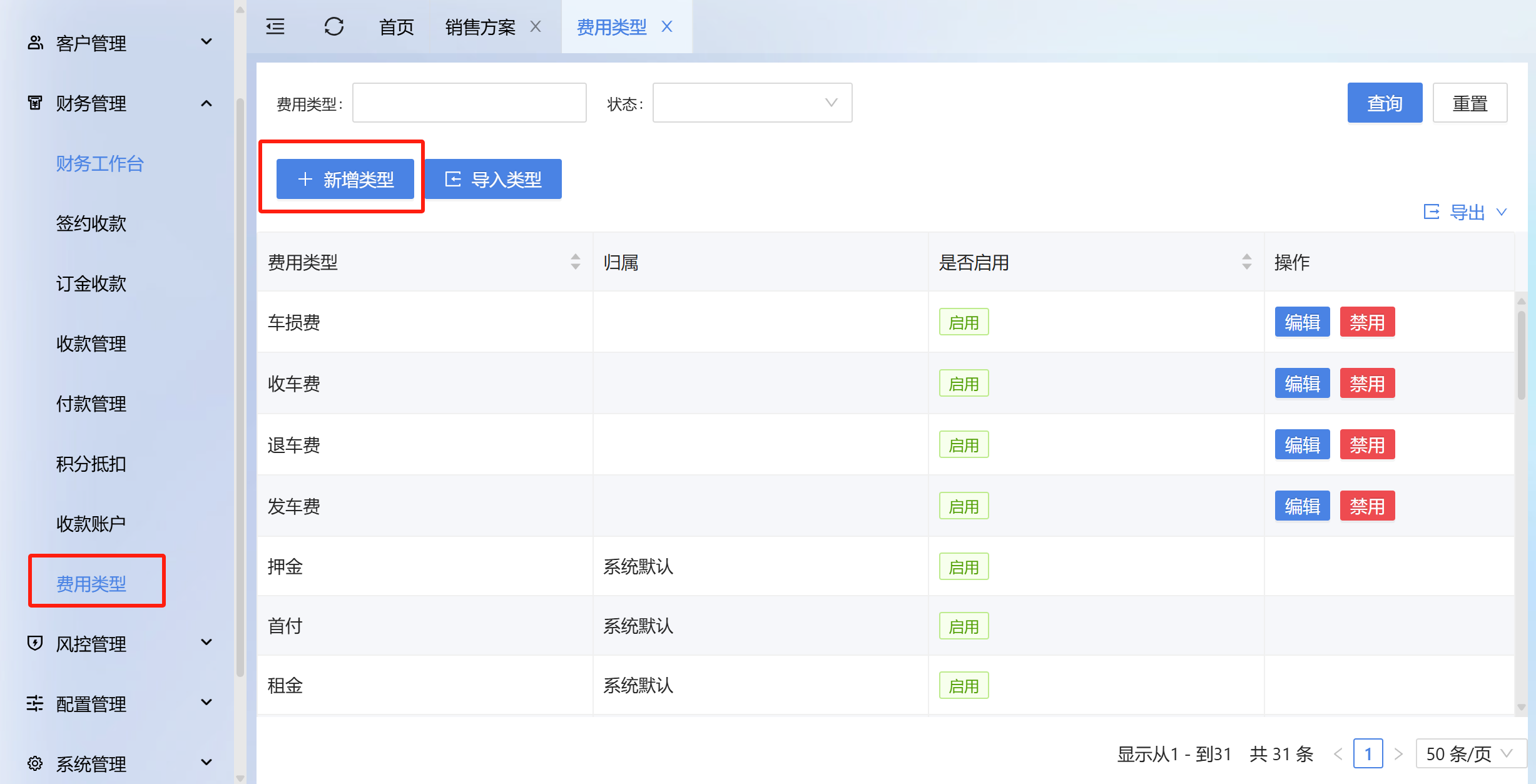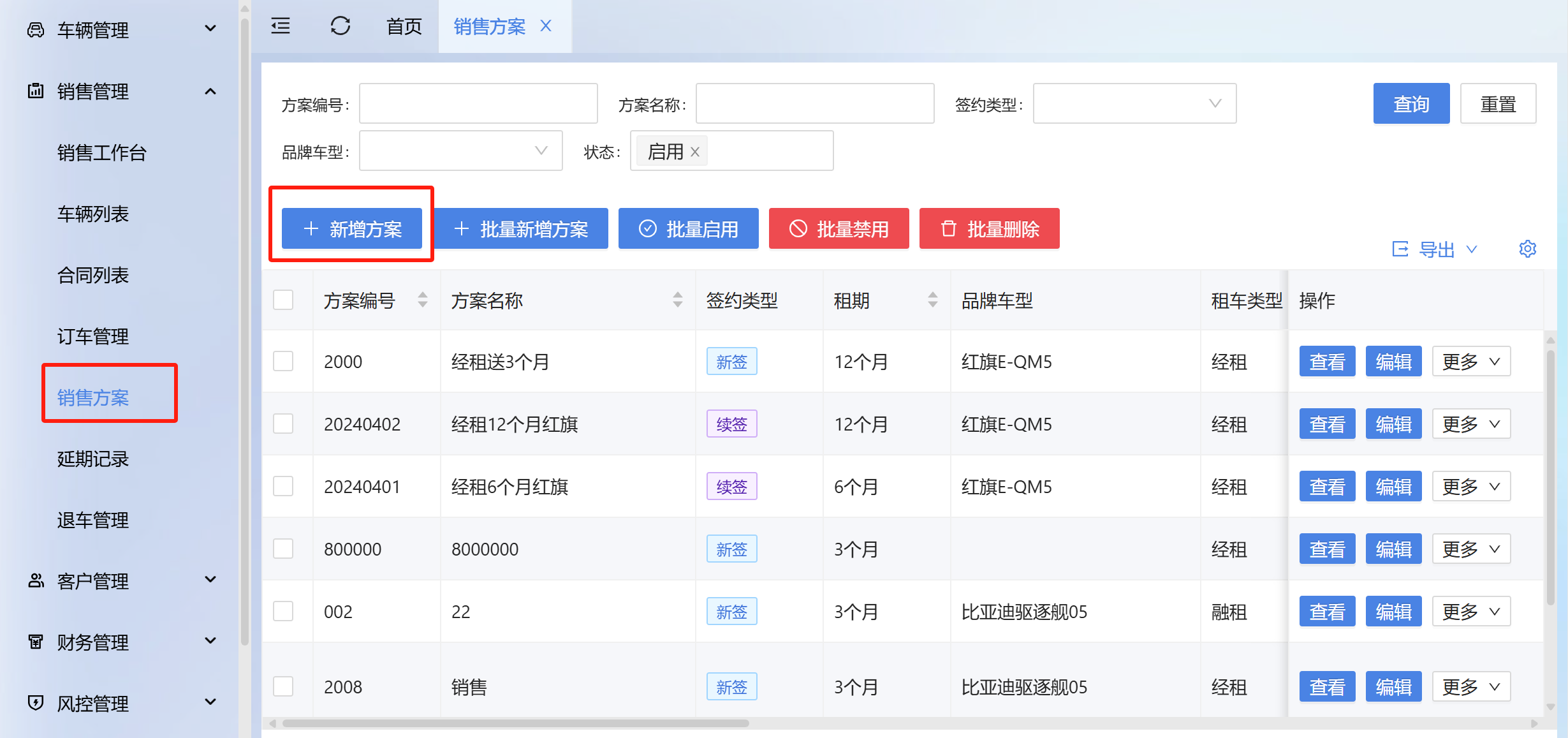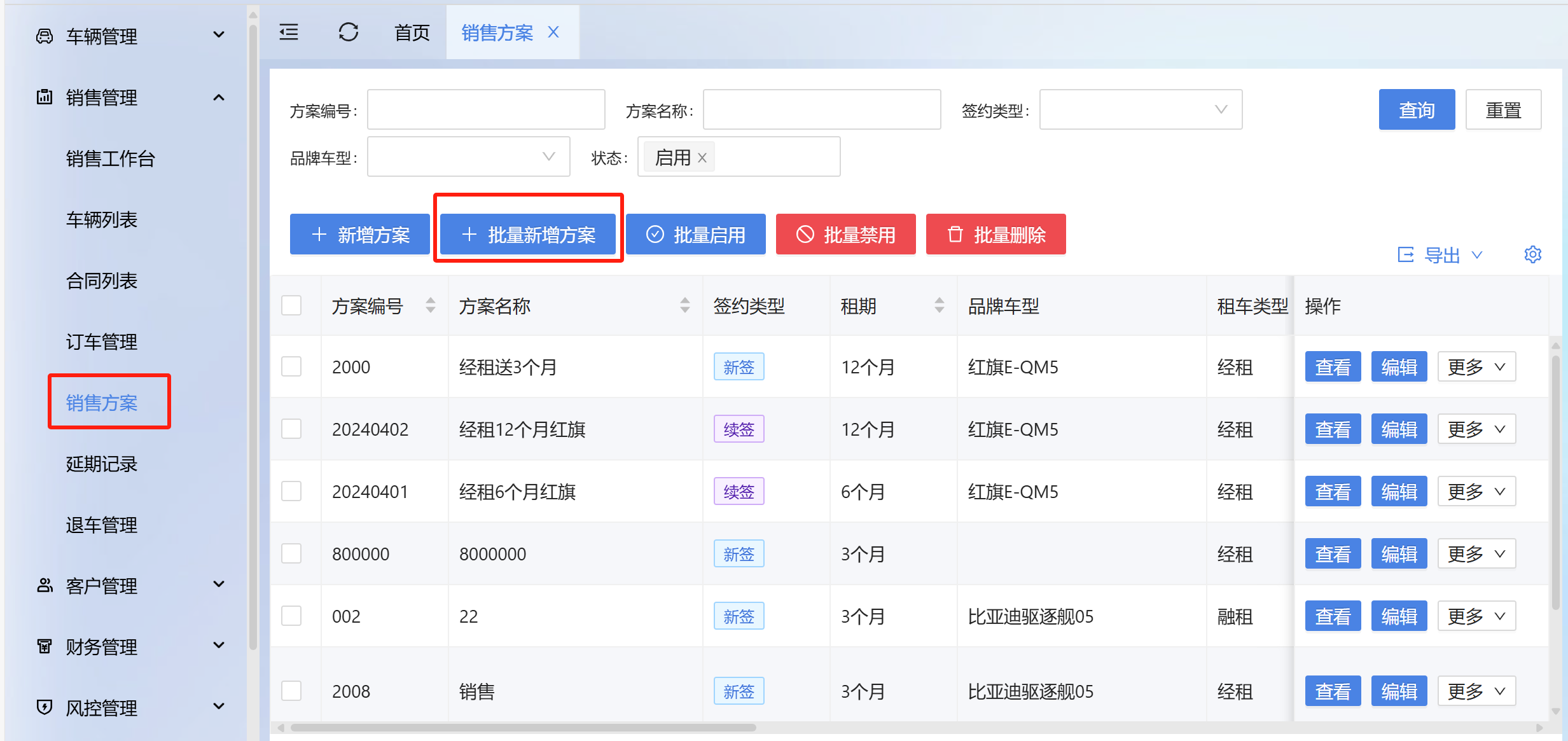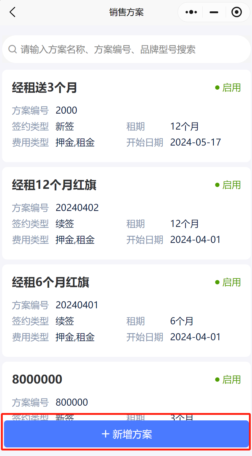 - PC端 电脑网页端有2种添加租赁方案的方式 - 方式一:单个添加方案 点击左侧菜单栏<font color=#D2691E>销售管理-销售方案-新增方案</font>,按照提示填写基础信息,红色<font color=#D2691E>*</font>号为必填项,可在费用项目信息中设置销售方案涉及的费用项目金额,如押金、租金等。  若费用类型中没有需要的选项,可在<font color=#D2691E>财务管理-费用类型-新增类型</font>,添加需要的费用类型。  方式二:批量添加方案 点击左侧菜单栏<font color=#D2691E>销售管理-销售方案-批量新增方案</font>,点击<font color=#D2691E>下载导入模版文件</font>, 将销售方案信息按导出的表格格式录入,表格完成后点击<font color=#D2691E>上传文件</font>,上传后将显示有几行数据上传成功或失败,若上传失败可点击<font color=#D2691E>下载导入结果</font>查看原因  - 小程序端 微信小程序端添加销售方案,需要点击<font color=#D2691E>快捷入口-销售方案-新增方案</font>,按照填写信息,点击<font color=#D2691E>确认</font>进行保存。