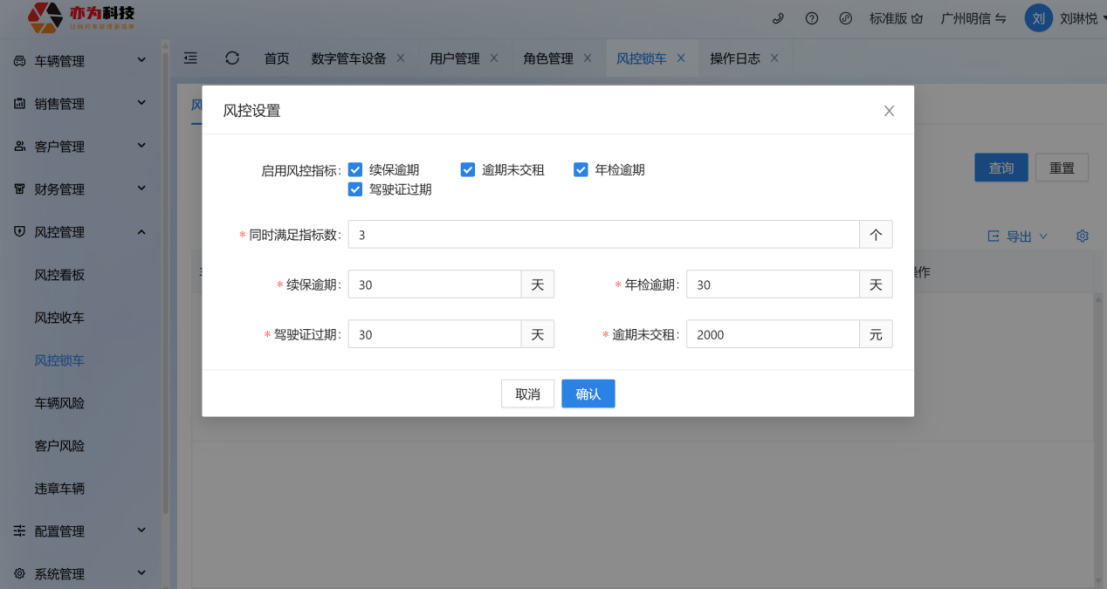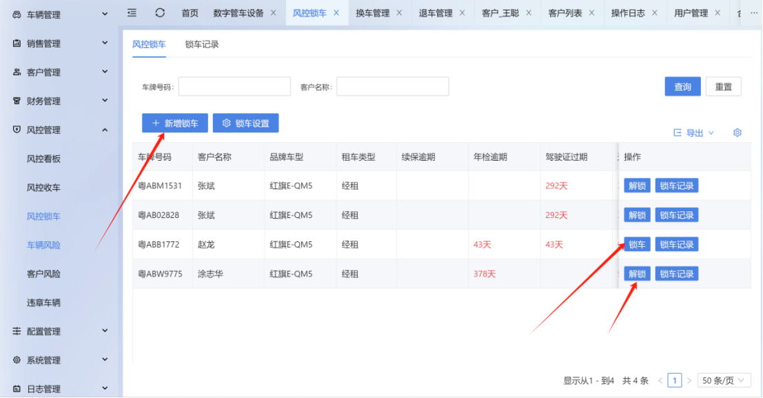 功能简介:车辆安装数字车钥匙后,可根据司机产生的风控行为决定是否冻结司机对车辆的控制权限 <font color=#FF4500>风控锁车</font> 打开【风控管理】-【风控锁车】,点击<font color=#D2691E>‘锁车设置’</font>,可像风控收车一样设定锁车标准,目前可设置的指标包含<font color=#D2691E>续保逾期、逾期未交租、年检逾期、驾驶证过期</font>;达到设置标准后在<font color=#D2691E>‘风控锁车’</font>列表找到对应司机,点击<font color=#D2691E>‘锁车’</font>,填写相关信息后即可收回司机控车权限    <font color=#FF4500>解锁</font> 方法一:若是对风控锁车提醒记录操作锁车,则直接在同一页面找到对应记录点击<font color=#D2691E>‘解锁’</font>,确认解锁后即可释放司机控车权限; 方法二:对风控锁车提醒记录操作锁车或直接点击‘新增锁车’进行锁车,皆可在<font color=#D2691E>‘客户列表’</font>找到对应客户名称,点击<font color=#D2691E>‘更多’-‘解锁’</font>,也可进行解锁  在小程序中也可点击【风控管理】-【风控锁车】查看<font color=#D2691E>锁车记录</font>和<font color=#D2691E>新增锁车
