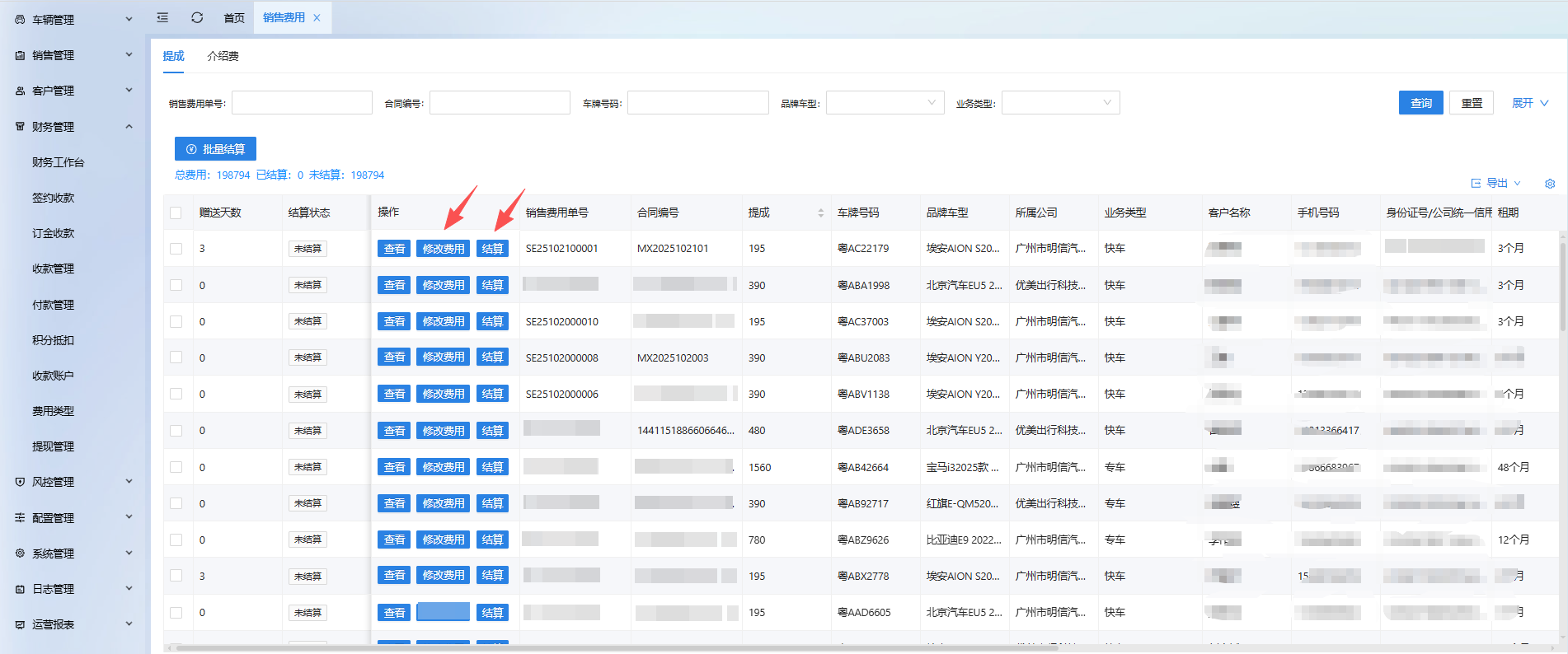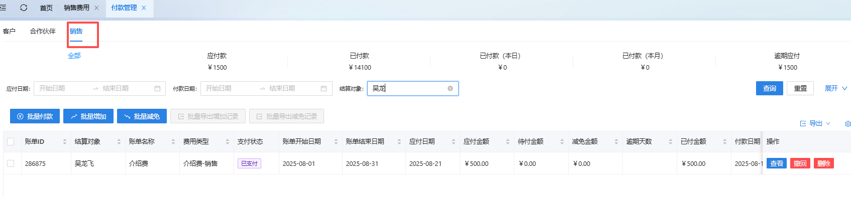#### 功能说明:销售合同中涉及到的销售提成和推荐人介绍费可在此页面操作金额录入和结算 ------------ ### 以提成费用结算为例 - 在创建合同并操作签约收款后,会在【销售费用】-【提成】标签页自动生成提成费用单据,可点击单据的"修改费用"按钮进行提成费用的编辑  - 点击“结算”或勾选多个单据点击“批量结算”配置账单信息进行提交,则会在【付款管理】-【销售】生成付款账单,在此操作付款即可完成结算   同理,在同样的操作下可完成介绍费的费用修改和付款结算。