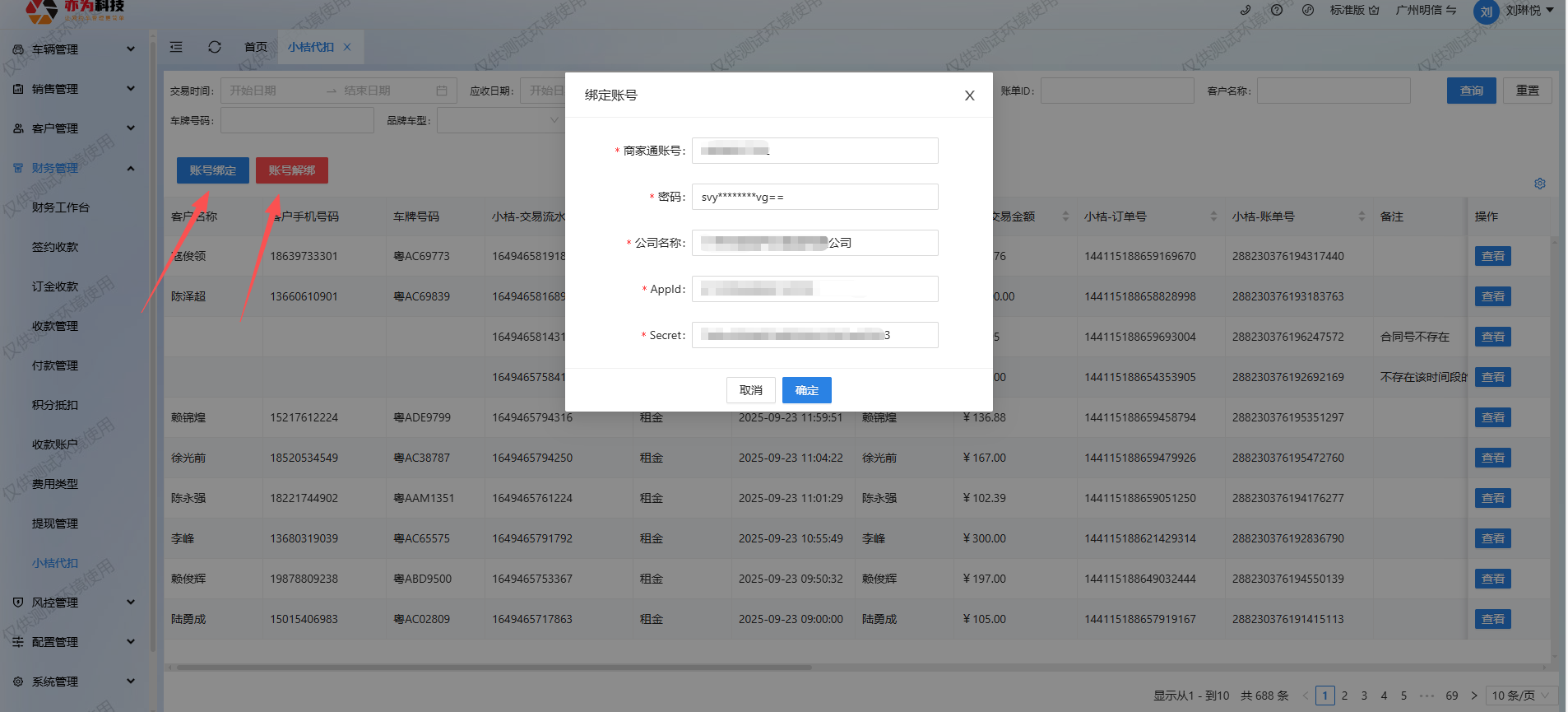 ### 功能说明:将司机在滴滴小桔平台的租金代扣流水上传到管车系统完成账单自动核销,并可查看代扣明细。 ------------ ### 操作说明 首先打开【小桔代扣】界面,点击账号绑定,向平台工作人员获取管车系统账号的APPId和Secret,再将商家通的主账号和密码、公司名称填写上,即可完成账号绑定。同时可完成账号解绑。  绑定完成后会在0点商家通获取当前日期和前一天日期的代扣流水上传到管车系统,同时收款管理的应收账单会自动生成收款流水,完成收款。 - 举例:在10月23日白天完成账号绑定,将在10月24日0点获取10月24日和10月23日全天的代扣流水到管车系统========