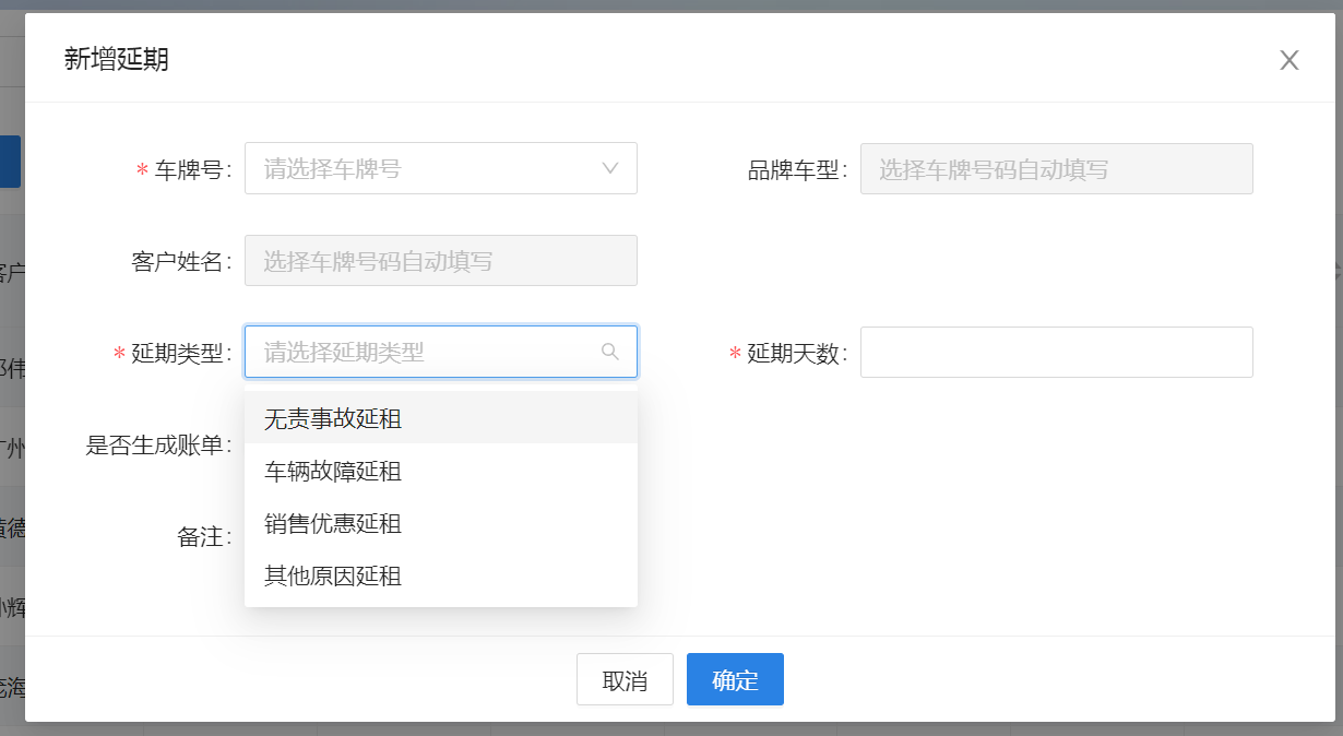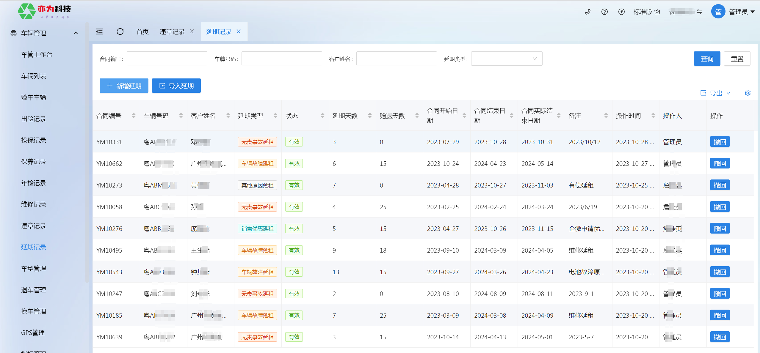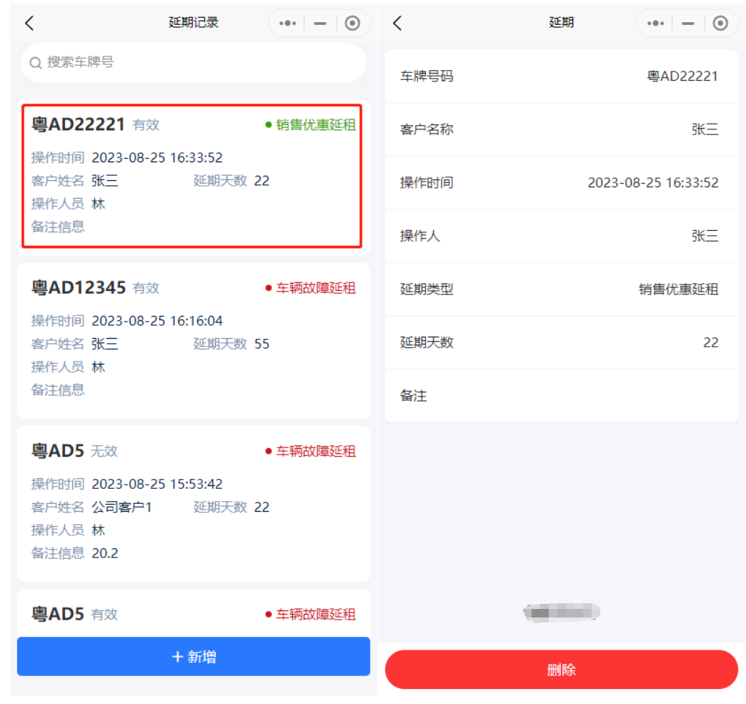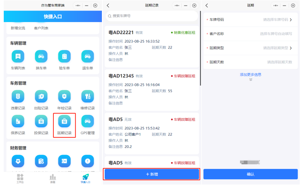 延期记录用于记录车辆延租的相关信息,对延期车辆进行记录及操作,支持新增、撤回、删除、导出车辆记录,可通过下载模板进行填写的方式批量导入。延期主要适用于合同以外的延租事项,如果是合同内的赠送天数建议直接签署合同时填写赠送天数。   微信小程序可通过快捷入口进入延期记录。