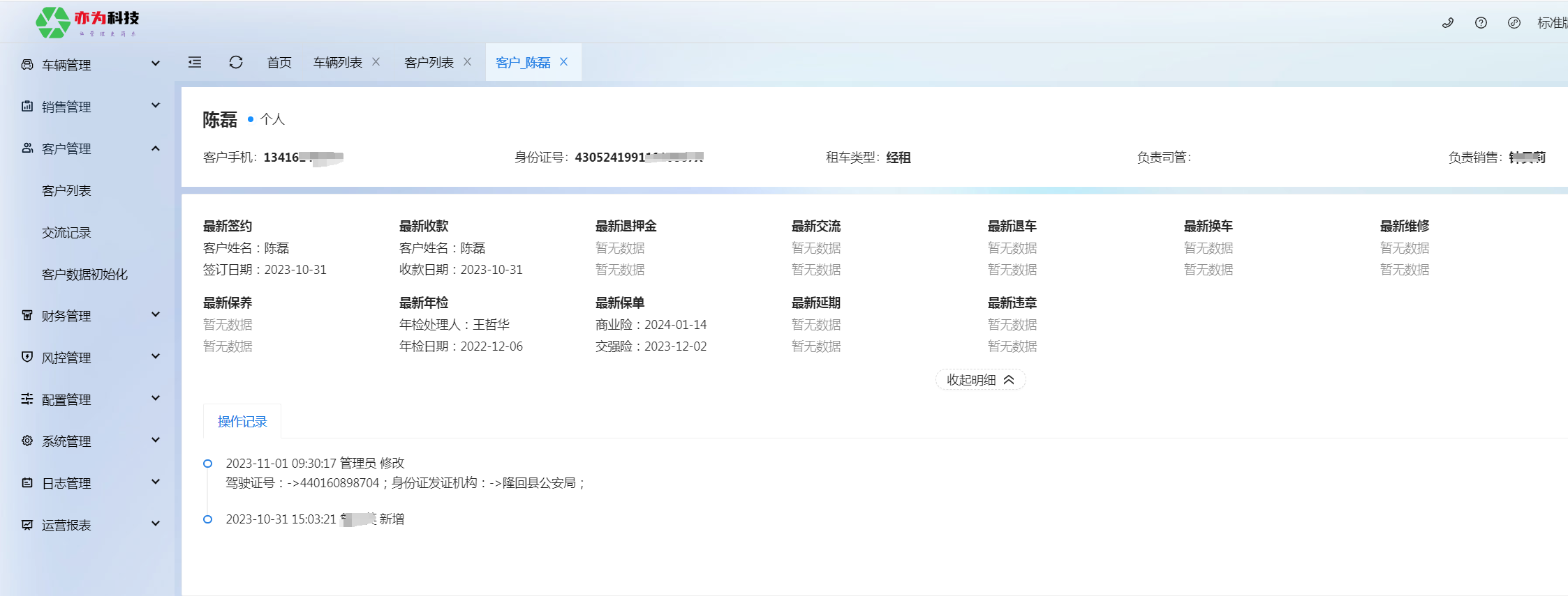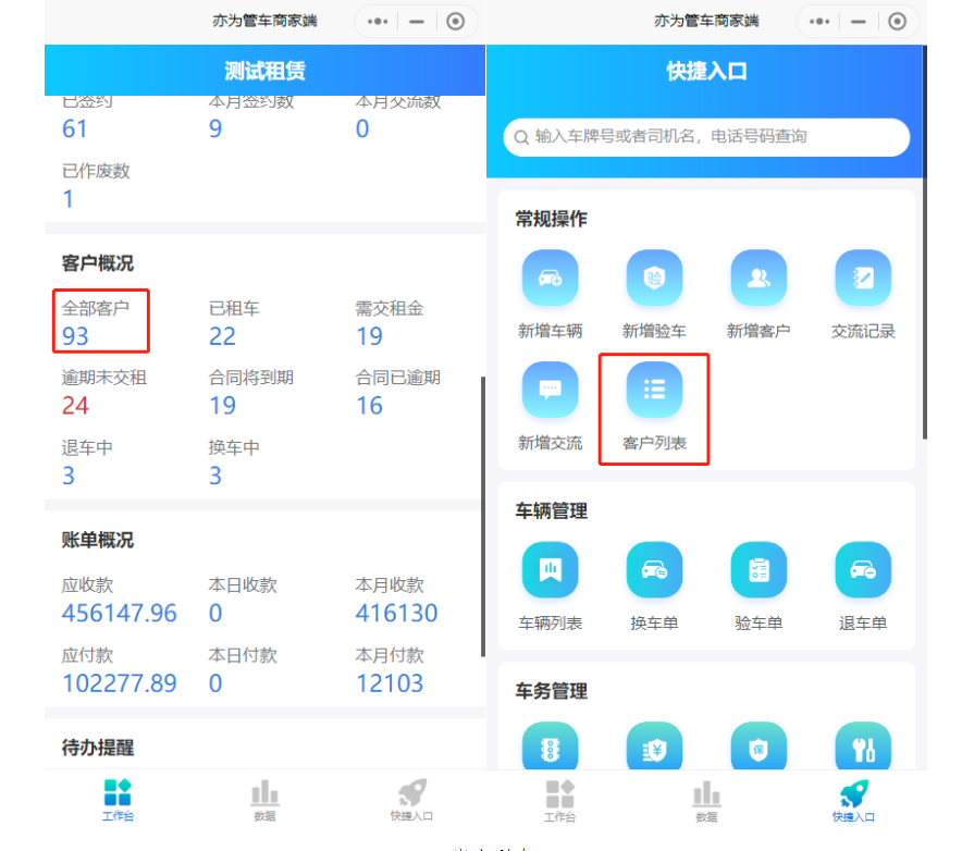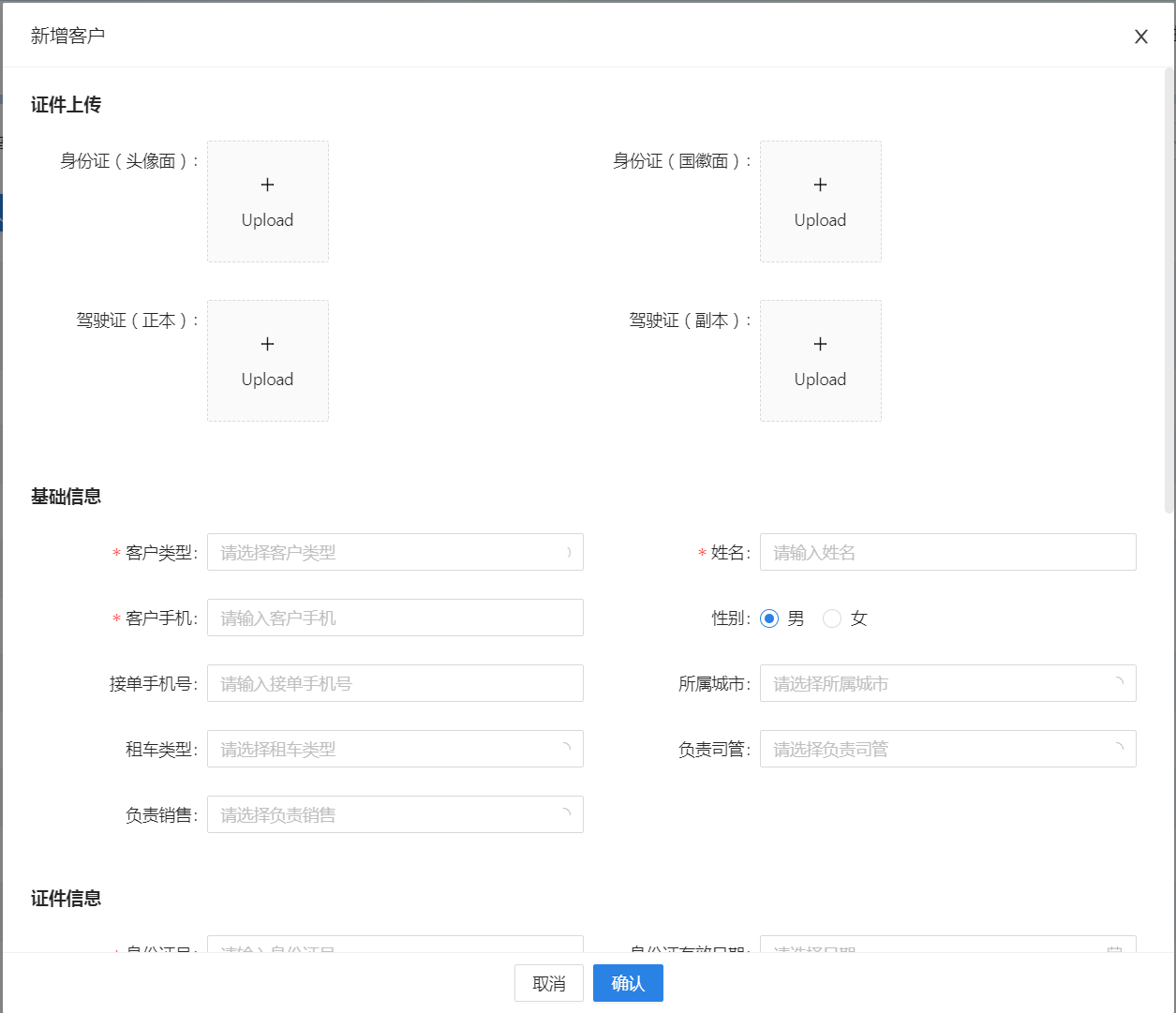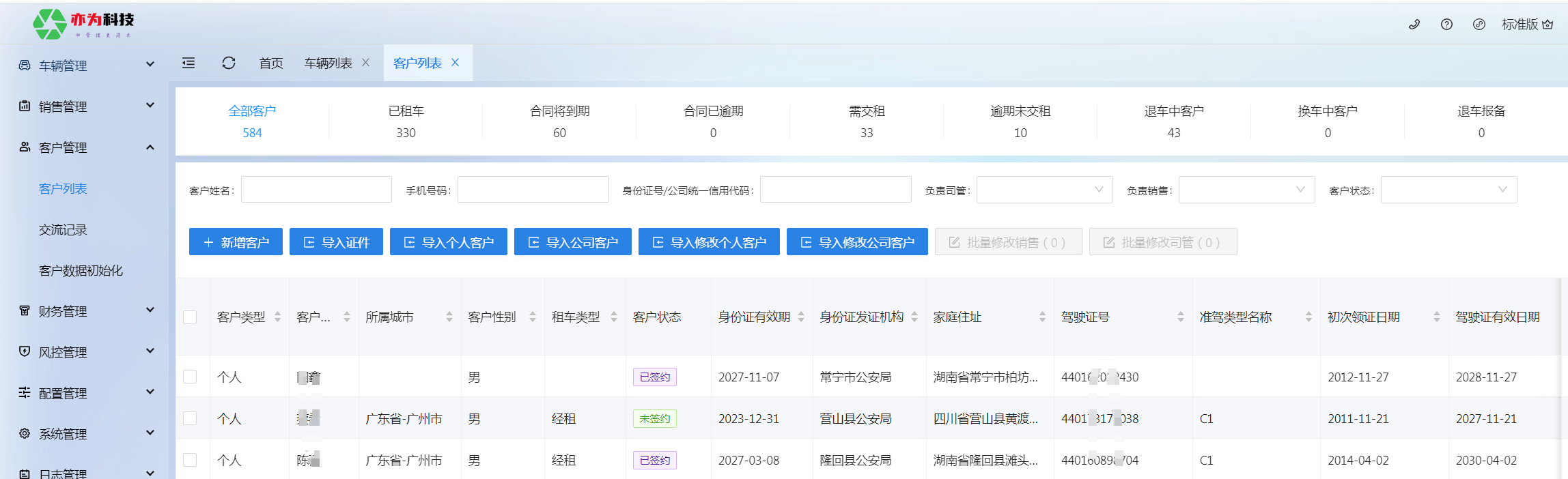 客户列表用于记录客户的信息。支持通过下载模板进行填写的方式导入证件、导入个人客户、导入公司客户、导入修改个人客户、导入修改公司客户。可通过勾选的方式批量修改销售及司管。  微信小程序可通过工作台的全部客户或快捷入口的客户列表进入。  (1)新增客户需上传证件,填写基本信息、证件信息、其它信息。  (2)可对某一条客户信息进行编辑操作,修改客户信息;查看操作,查看详细信息及租车的车辆信息;删除操作,删除客户信息。