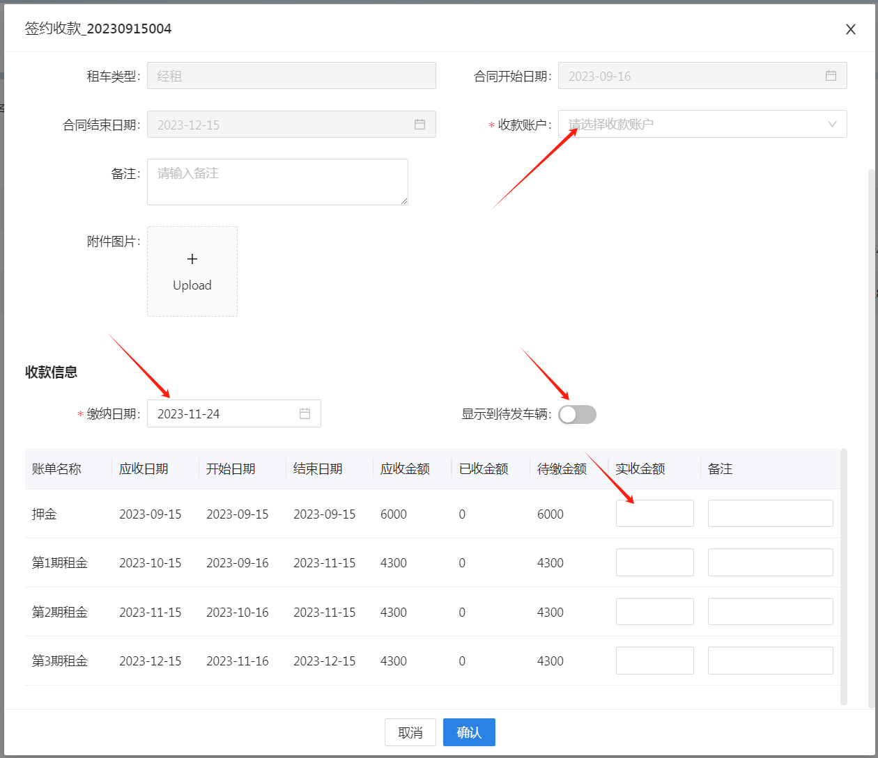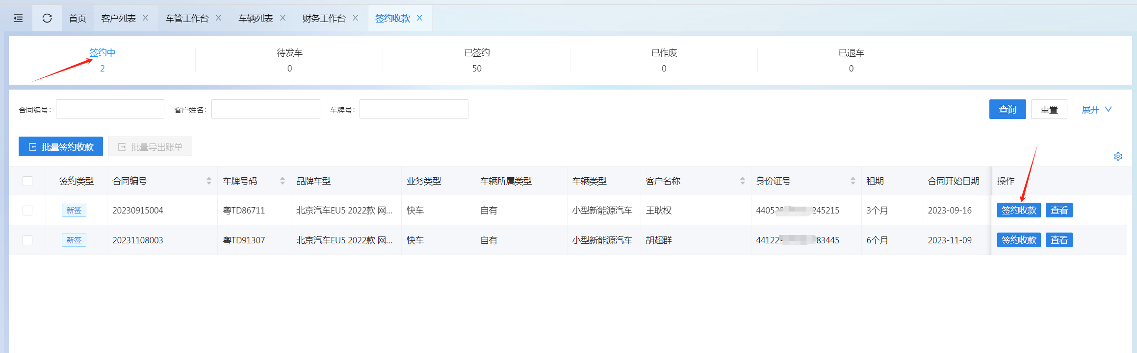 签约收款用于查看及操作签约信息。所有合同生成都需要通过签约收款进行。目前主要包括新签和续签。   显示待发车辆为选择是,车辆将进入待发状态,如果未选,则车辆状态为已租。 续签无需发车。