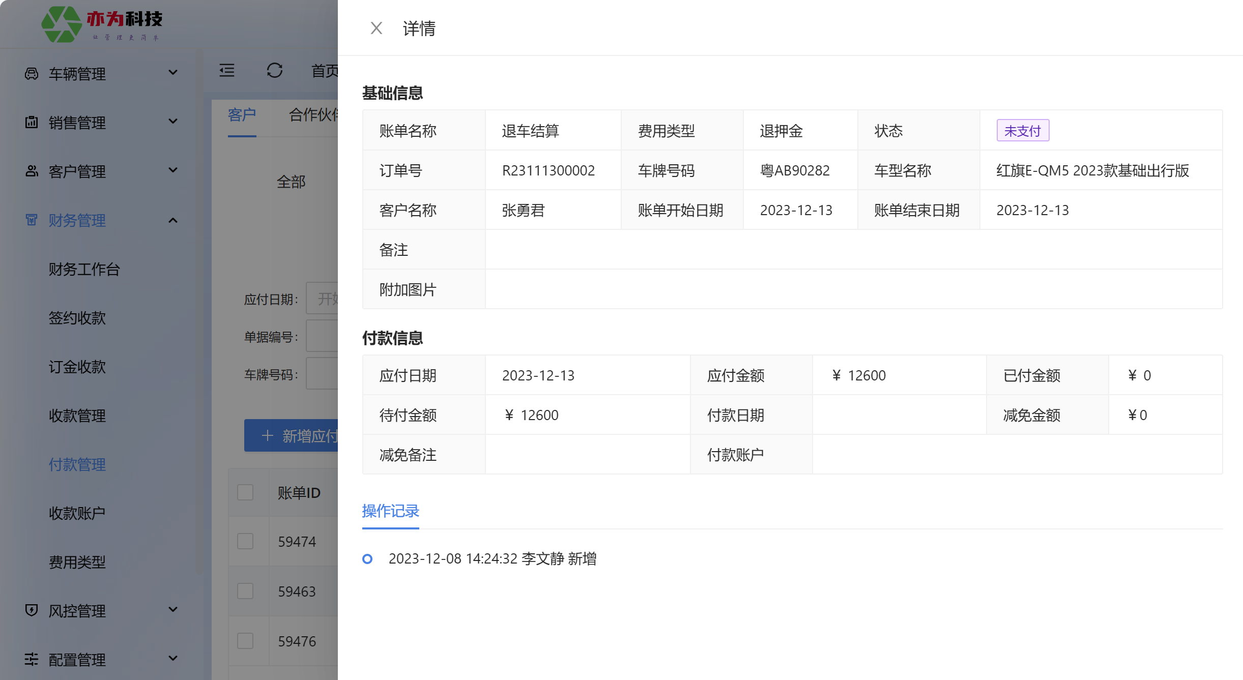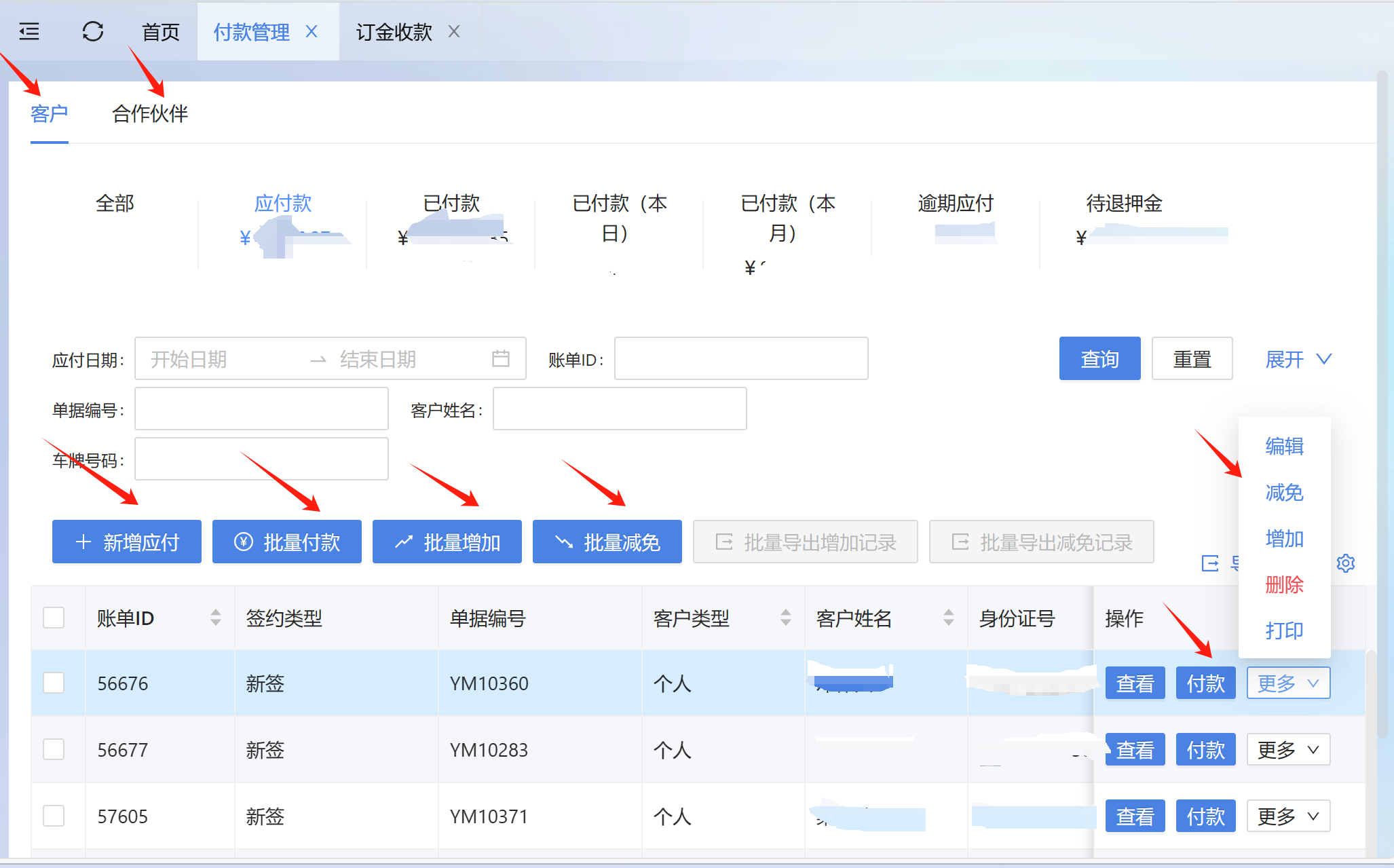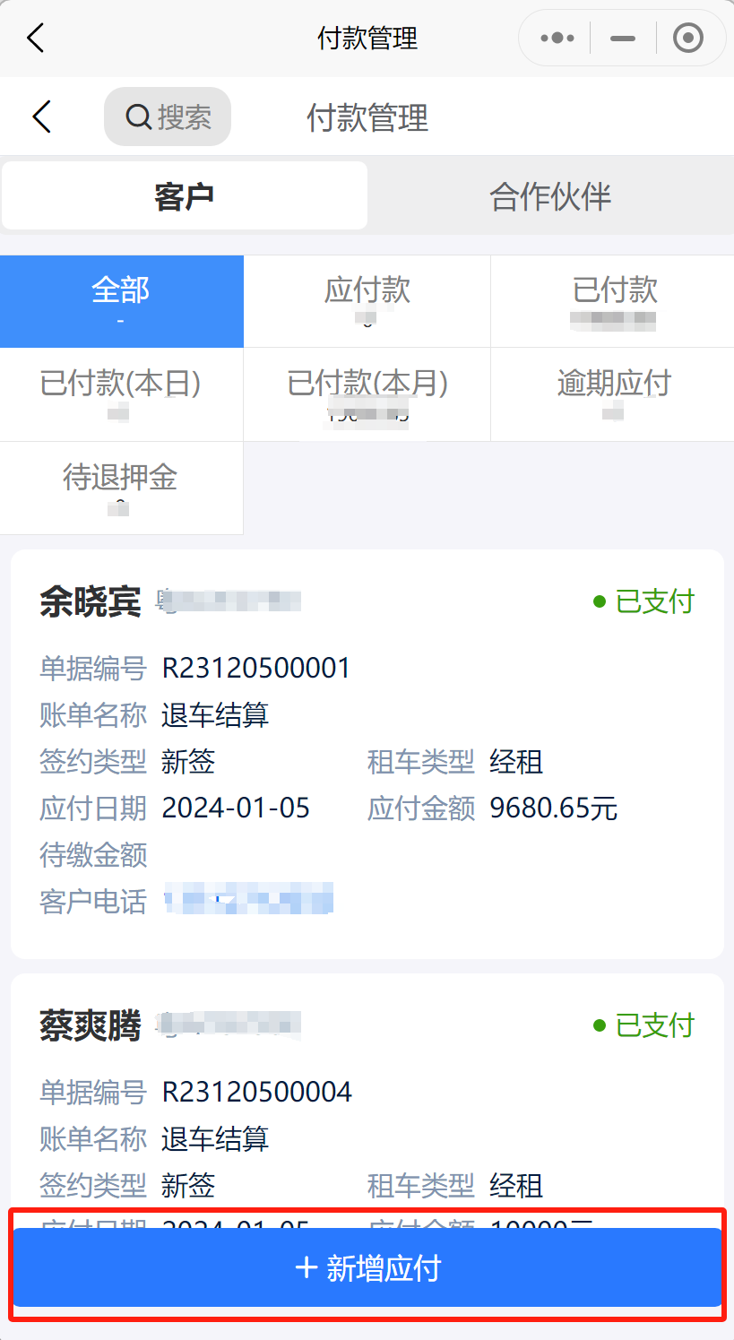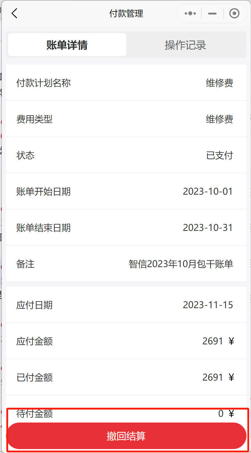 付款管理用于操作付款以及查看付款记录和生成应付款账单,支持手工录入应付账单、付款、付款前增加/减免费用、通过勾选批量付款、批量增加和减免费用,批量导出增加记录、批量导出减免记录,在付款金额有误时可撤回付款,支持查看、删除和打印付款账单记录。   (1)新增付款需要填写账单基础信息和费用信息  (2)筛选应付款列表可对应付款账单进行付款  (3)可查看账单的详情信息和操作记录  微信小程序可通过快捷入口进入付款管理进行操作。