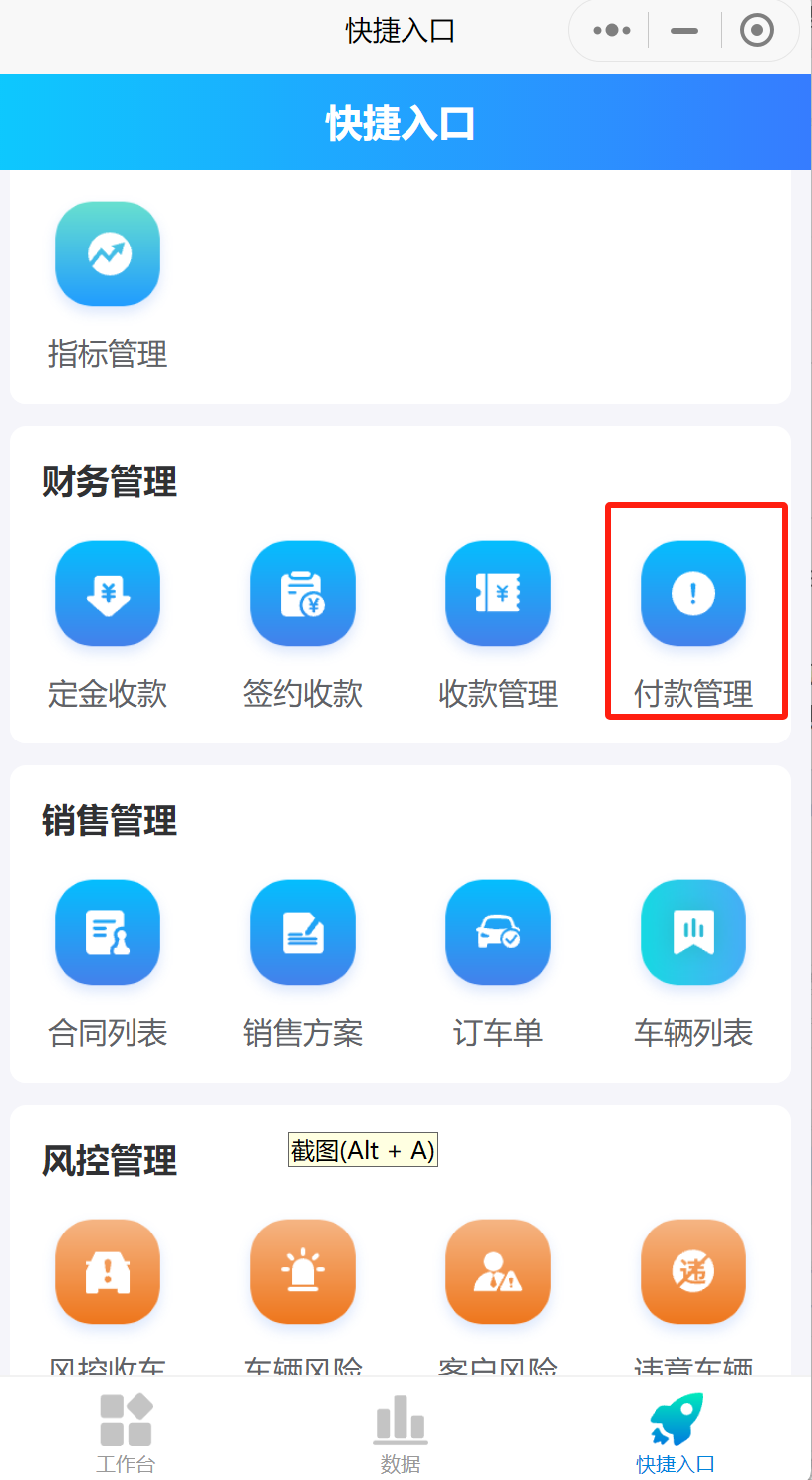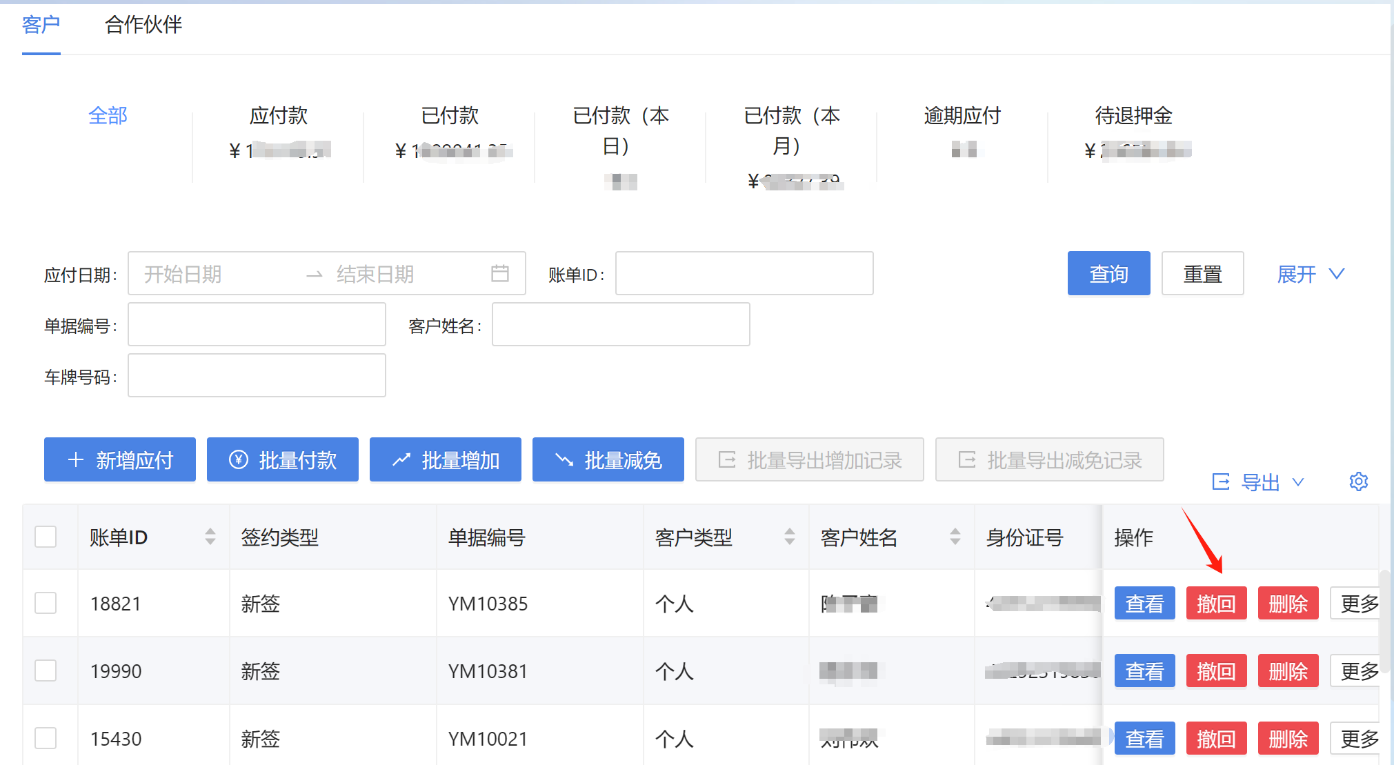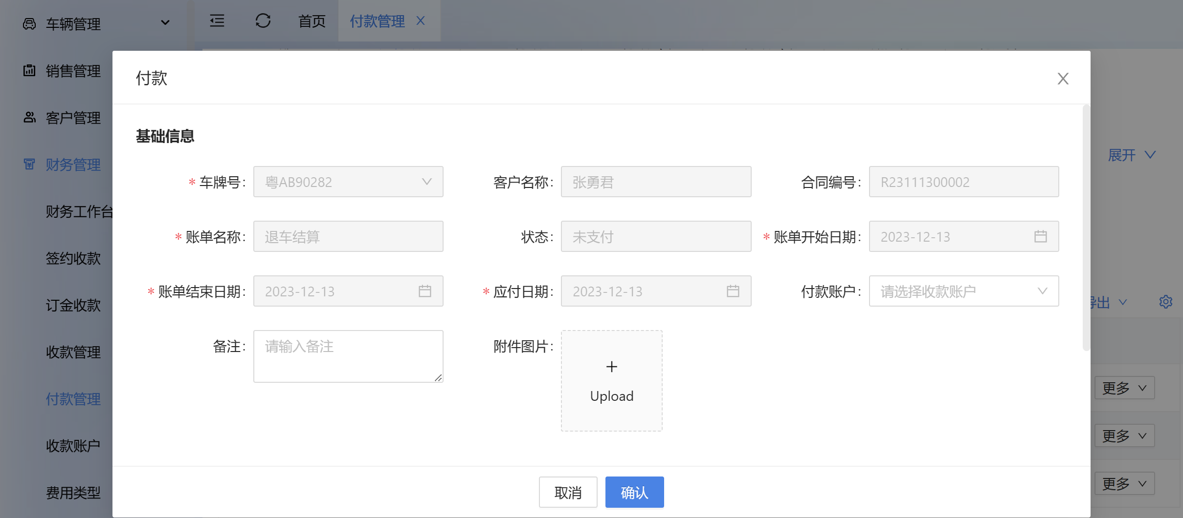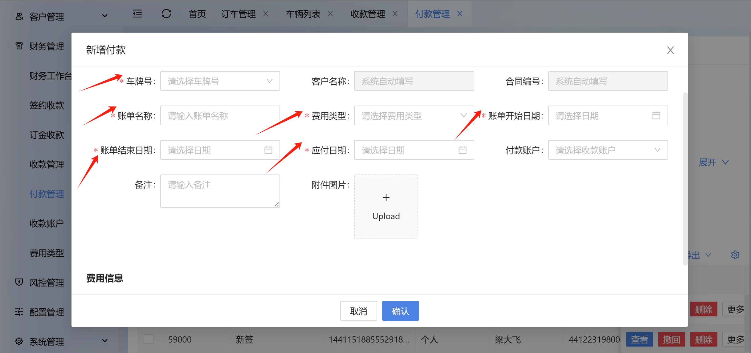 付款管理用于操作付款以及查看付款记录和生成应付款账单,支持手工录入应付账单、付款、付款前增加/减免费用、通过勾选批量付款、批量增加和减免费用,批量导出增加记录、批量导出减免记录,在付款金额有误时可撤回付款,支持查看、删除和打印付款账单记录。   (1)新增付款需要填写账单基础信息和费用信息  (2)筛选应付款列表可对应付款账单进行付款  (3)可查看账单的详情信息和操作记录  微信小程序可通过快捷入口进入付款管理进行操作。