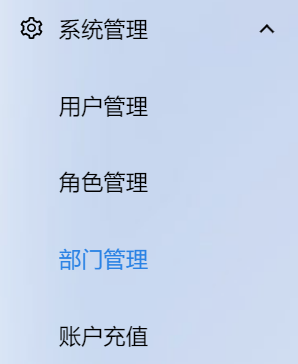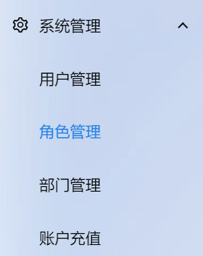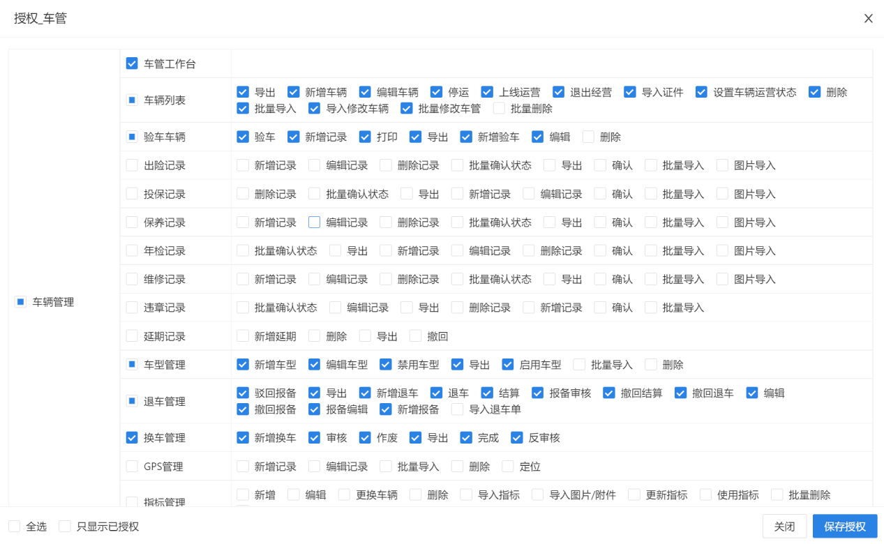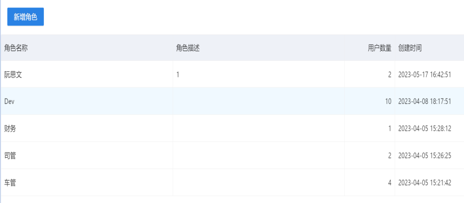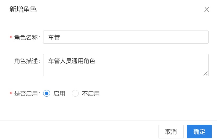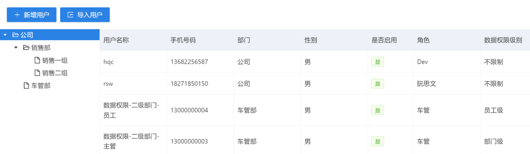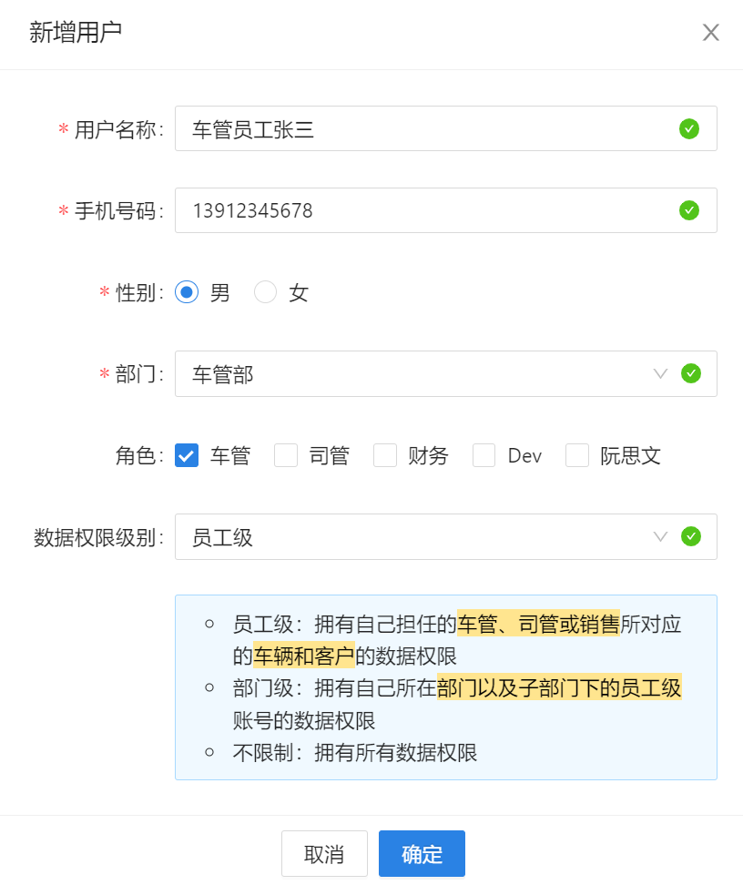 说明:系统管理主要包括用户管理、角色管理、部门管理等模块 温馨提示:用户管理指创建用户账号,分配不同的角色权限,以及数据权限。在使用用户管理之前,请先配置角色管理和部门管理 ## 角色管理 角色管理主要是创建角色,为不同类型的账号进行分类管理,不同角色可以分配不同的菜单权限和操作权限。 * 1. 点击菜单【系统管理】-【角色管理】,点击“新建角色”   * 填写角色名称,角色描述,点击“确定”  **新增角色** 选中角色,点击右侧的“授权”,勾选相应的菜单和操作,点击“保存授权”  根据实际业务选择每个角色的权限。 ## 部门管理 部门管理用于1个部门多个子部门之间的数据权限控制。 系统提供三个级别的数据权限,规则如下: 员工级:拥有自己担任的车管、司管或销售所对应的车辆和客户的数据权限 部门级:拥有自己所在部门以及子部门下的员工级账号的数据权限 不限制:拥有所有数据权限 * 1. 点击菜单【系统管理】-【部门管理】,   * 点击左侧【部门树图】,相应层级的“+”,填写部门信息,点击“确定”  ## 用户管理 创建用户账号,分配角色和数据权限 * 1. 点击菜单【系统管理】-【用户管理】,点击“新增用户”   * 1. 填写“用户名称”、“手机号码”,选择“部门”,勾选“角色”,选择“数据权限级别”,点击“确定”