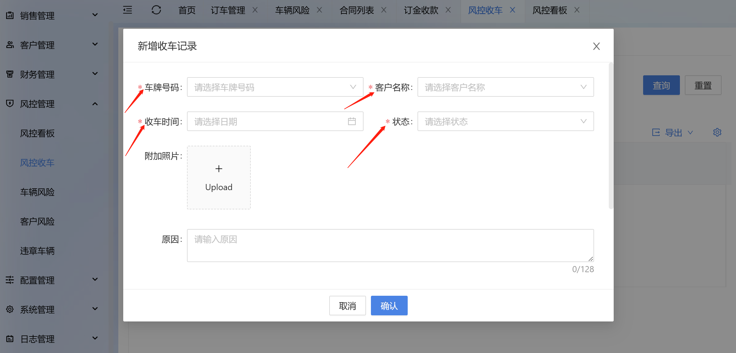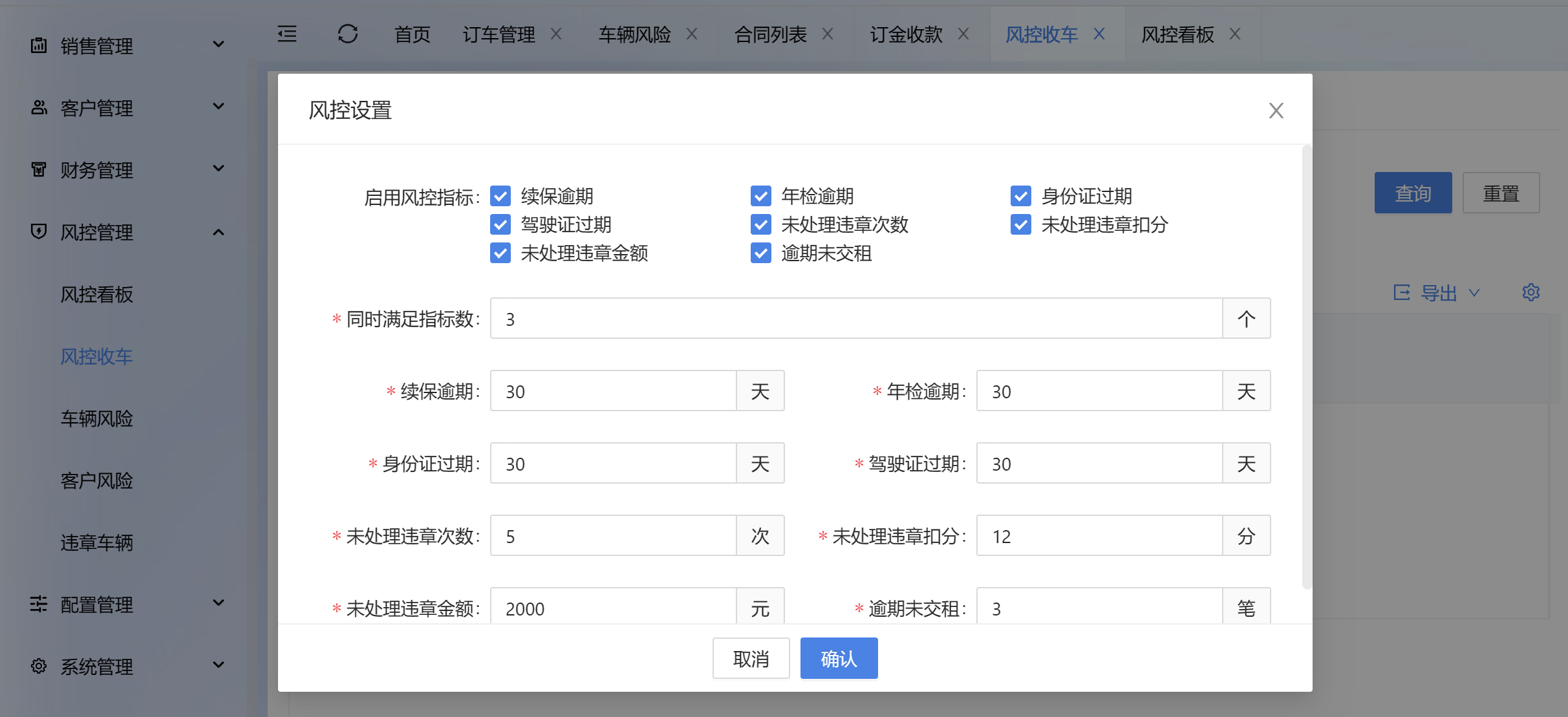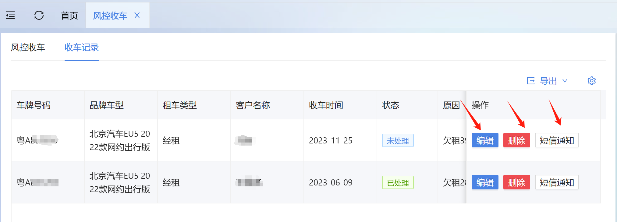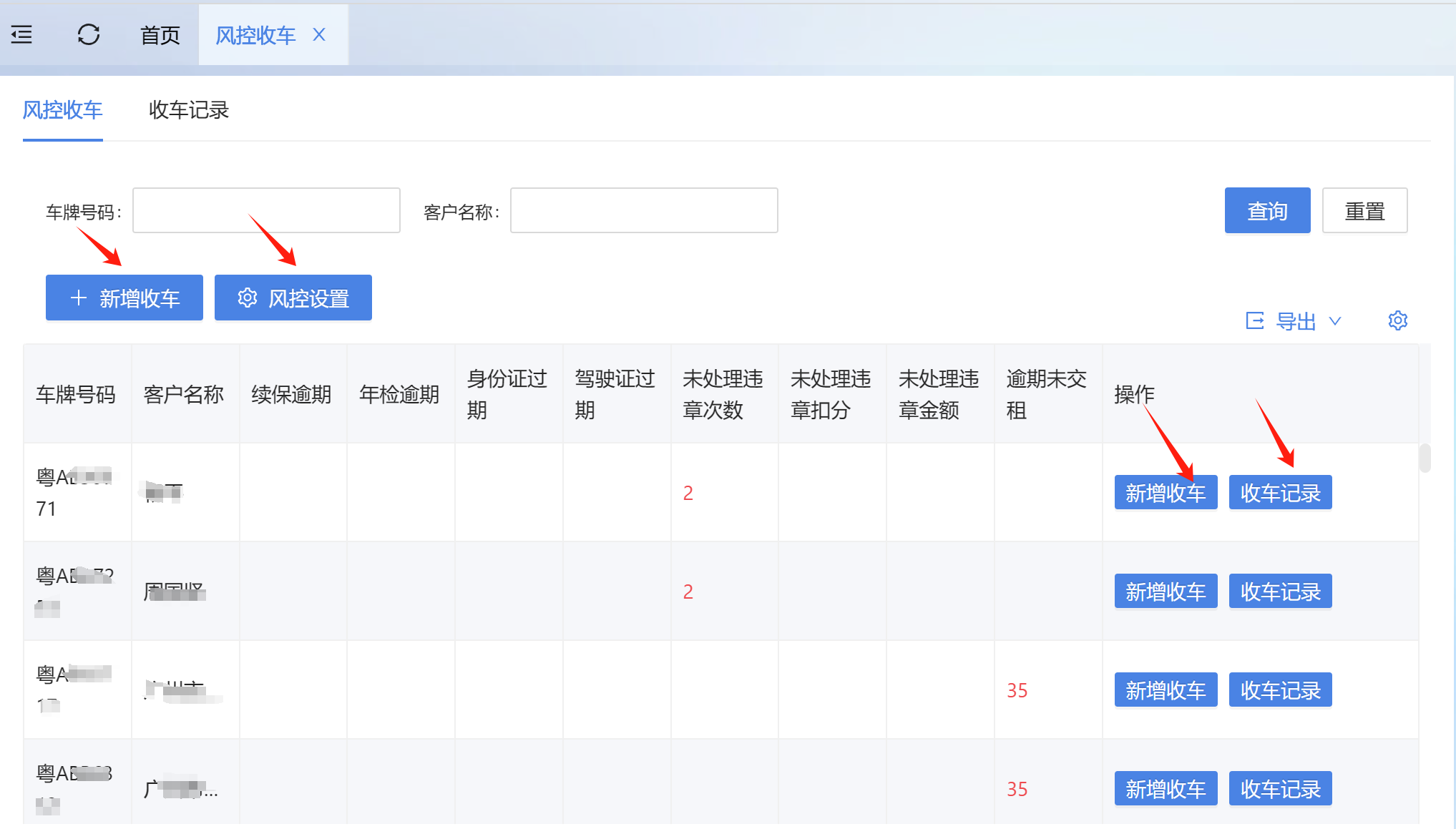 风控收车模块用于对达到风控标准的车辆进行收车,如续保逾期、年检逾期、身份证过期、驾驶证过期、未处理违章、逾期未交租车辆,支持新增收车记录、对已达到风控标准的车辆录入收车记录、对风控标准进行设置。可查看/编辑/删除收车记录,并对客户进行短信通知。     微信小程序可以从快捷入口进入到风控收车进行操作。
