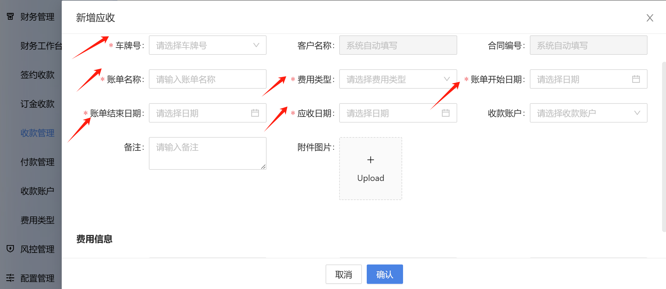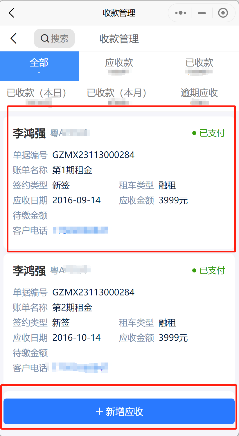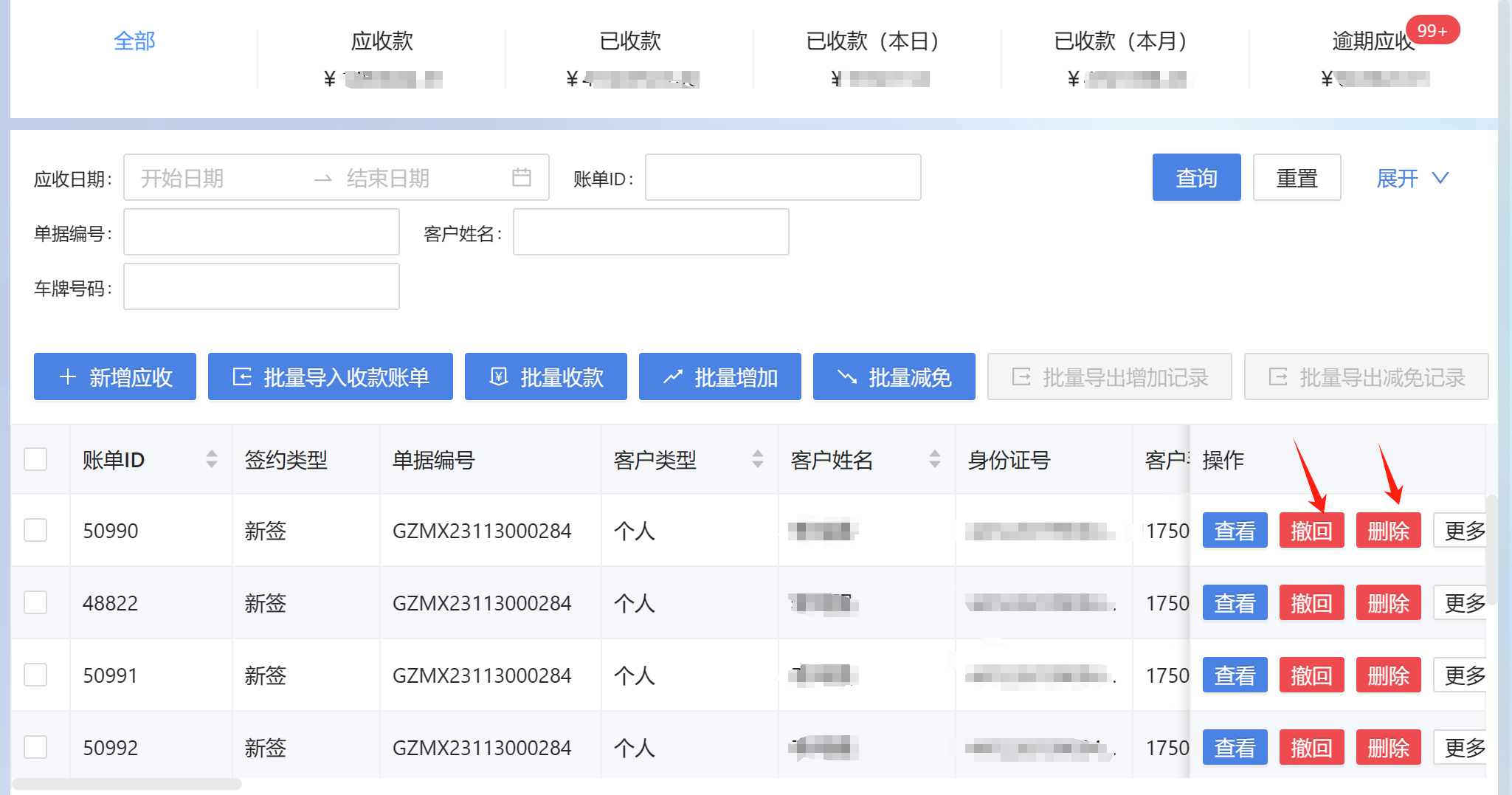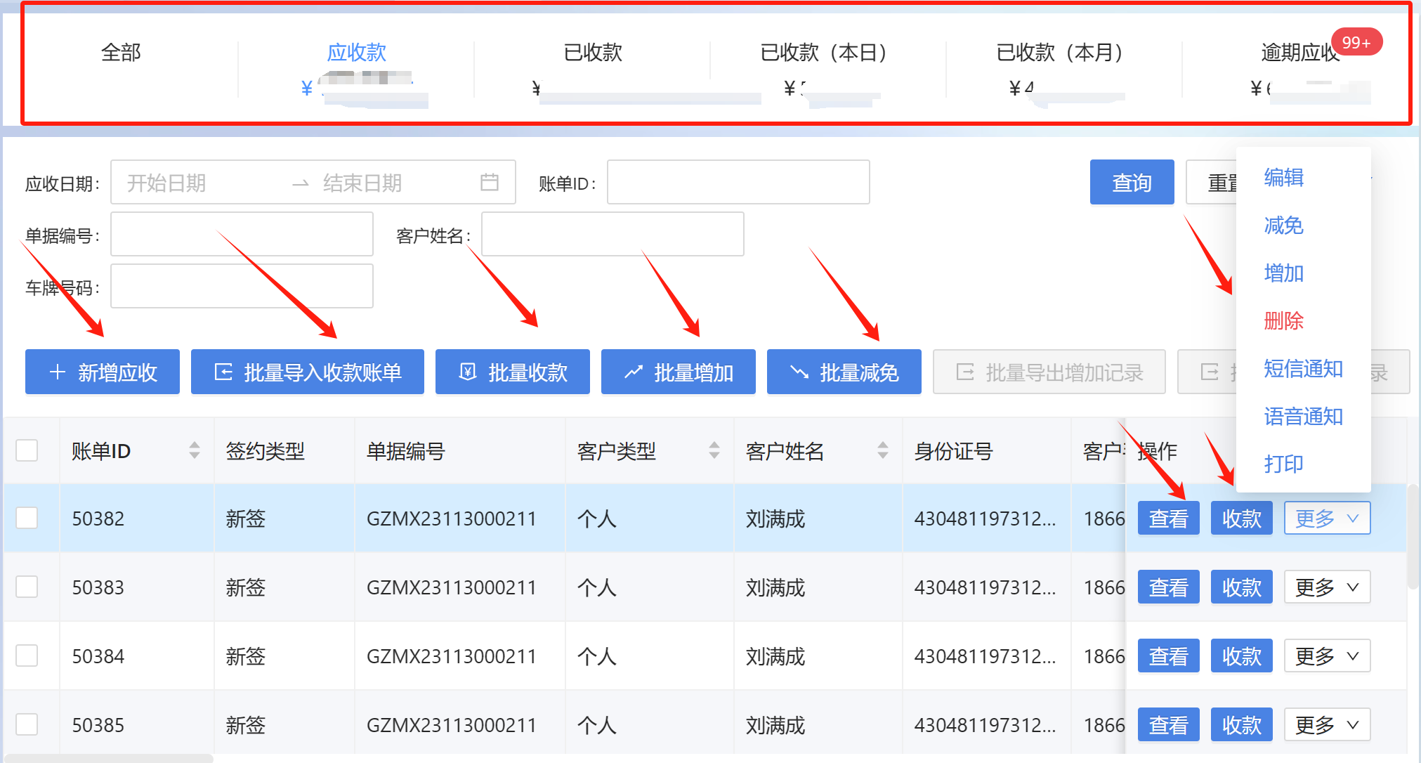 收款管理用于操作收款以及查看收款记录和生成应收款账单,支持手工录入应收帐单、通过下载模板填写批量导入收款账单、收款、收款前增加/减免费用、并可以通过勾选批量收款、批量增加/减免费用、批量导出增加/减免记录,在收款金额有误时可以撤回收款/撤回流水、以及编辑/删除/打印收款记录,同时可以通过语音/短信对客户发起通知。 账单列表页面上方显示账单的收款状态,点击可筛选,可通过关键信息查询账单   (1)新增应收账单需填写账单基础信息和费用信息  (2)筛选应收款列表信息,可对应收款账单进行收款。  微信小程序可以从快捷入口进入收款管理进行操作。