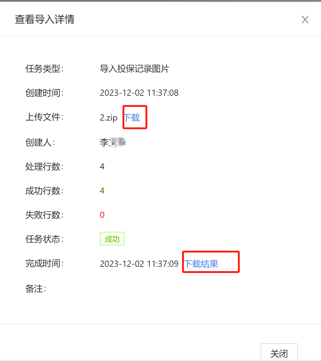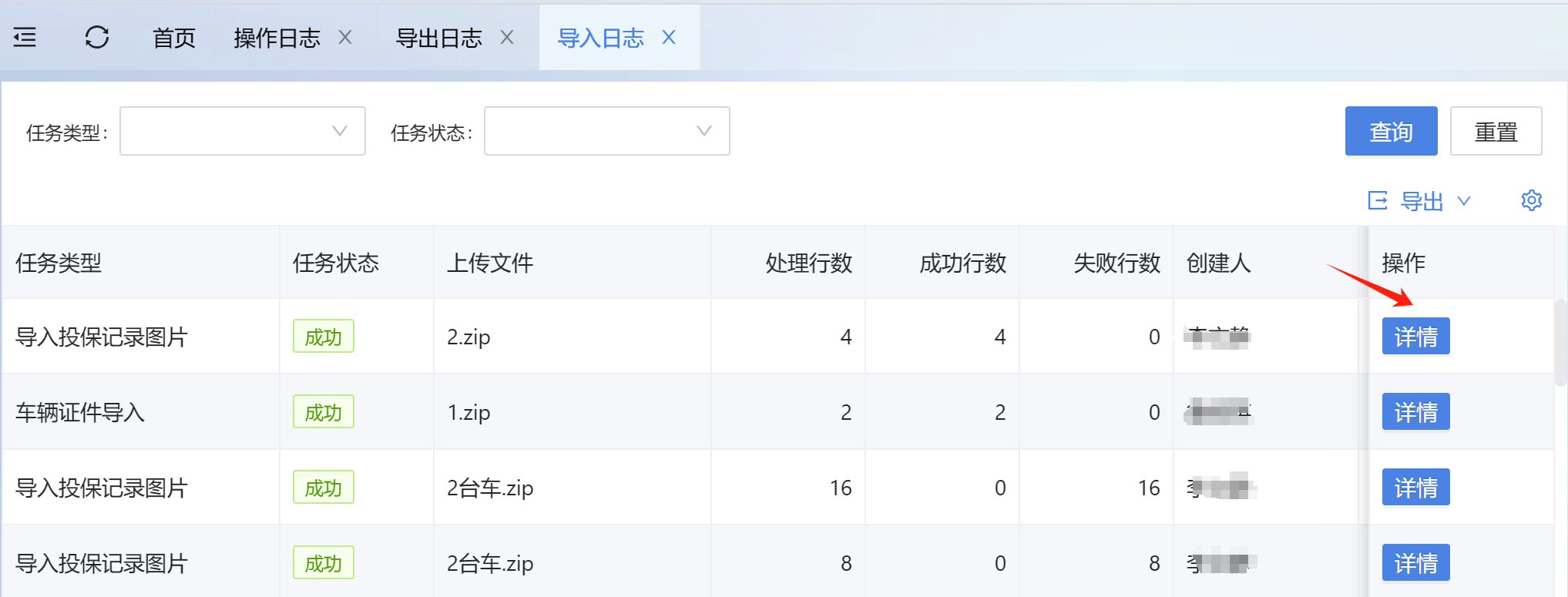 导入日志模块用于记录用户的导入操作详情,可查看任务类型、任务状态、上传文件命名、处理行数、成功行数、失败行数、创建人、导入时间、导入异常时间和备注,并可下载上传文件和导入结果。