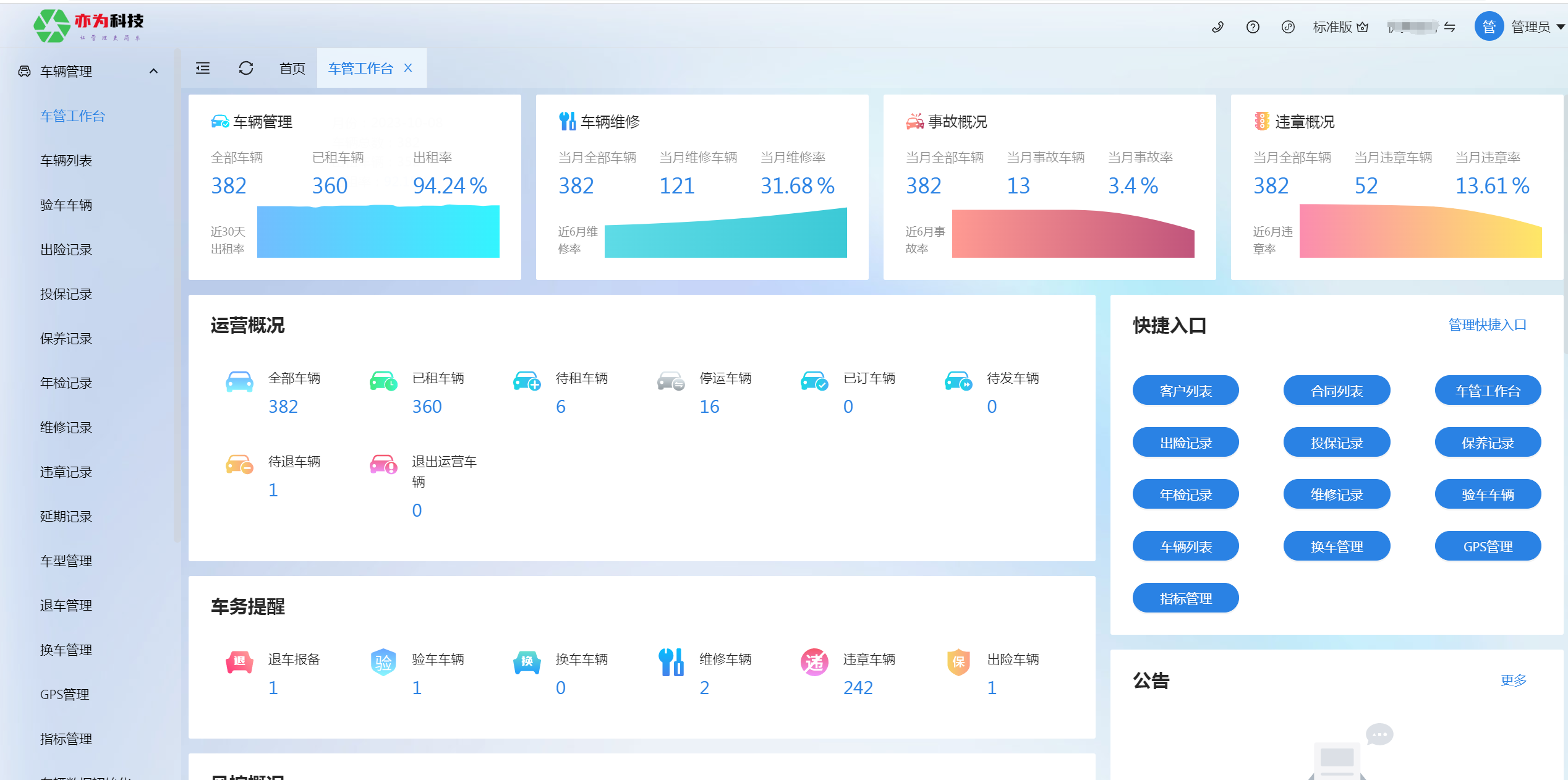 车管工作台可查看及操作运营概况、车务提醒、风控状况、快捷入口,可查看公告、图表示例。(若打开很多页面可右击打开的标签名进行操作)