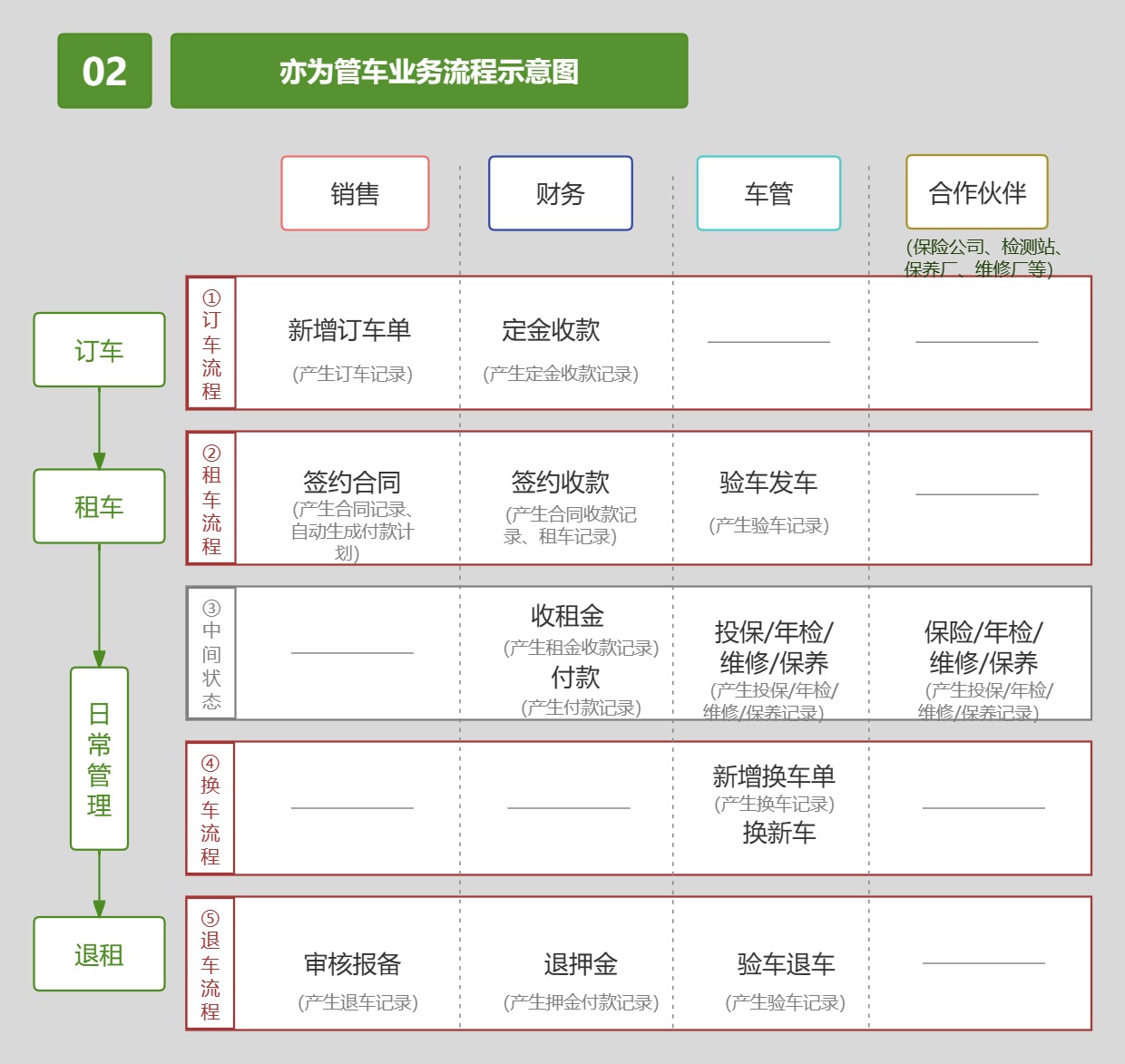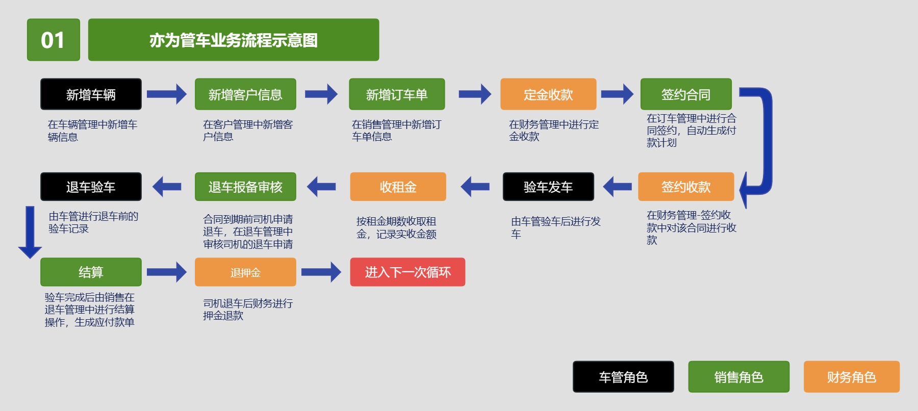 ## **亦为管车一般流程(面向租赁公司管理)** ##### **流程示意图:**   一、订车流程 (1)通过【客户管理】进入【客户列表】新增客户信息;如果客户已经存在系统、可跳过此步骤;【销售角色/司管角色/管理员】 (2)通过【车辆管理】进入【车辆列表】新增车辆信息;如果车辆已经存在系统、可跳过此步骤;【车管角色/管理员】 (3)通过【销售管理】进入【订车管理】新增订车单;【销售角色/管理员】 (4)通过【财务管理】进入【定金收款】操作收款;【财务角色/管理员】 二、租车流程 (1)通过【销售管理】进入【订车管理】操作【签约合同】,生成合同记录和付款计划;【销售角色/管理员】 (2)通过【财务管理】进入【签约收款】操作合同应付款的收款,点击【去验车】生成验车单【财务角色/管理员】 (3)通过【车辆管理】进入【验车车辆】操作【验车】,验车后操作【发车】【车管角色/管理员】 三、换车流程 (1)通过【车辆管理】进入【换车管理】操作【新增换车】;【车管角色/销售角色/管理员】 四、退车流程 (1)通过【车辆管理】进入【退车管理】,操作【报备审核】,点击【通过】后,操作【退车】;【车管角色/管理员】 (2)通过【车辆管理】进入【验车管理】,操作【验车】;【车管角色/管理员】 (3)通过【车辆管理】进入【退车管理】,操作【结算】【车管角色/管理员】 (4)通过【财务管理】进入【付款管理】,操作【付款】,退回押金,完成退车流程。【财务角色/管理员】