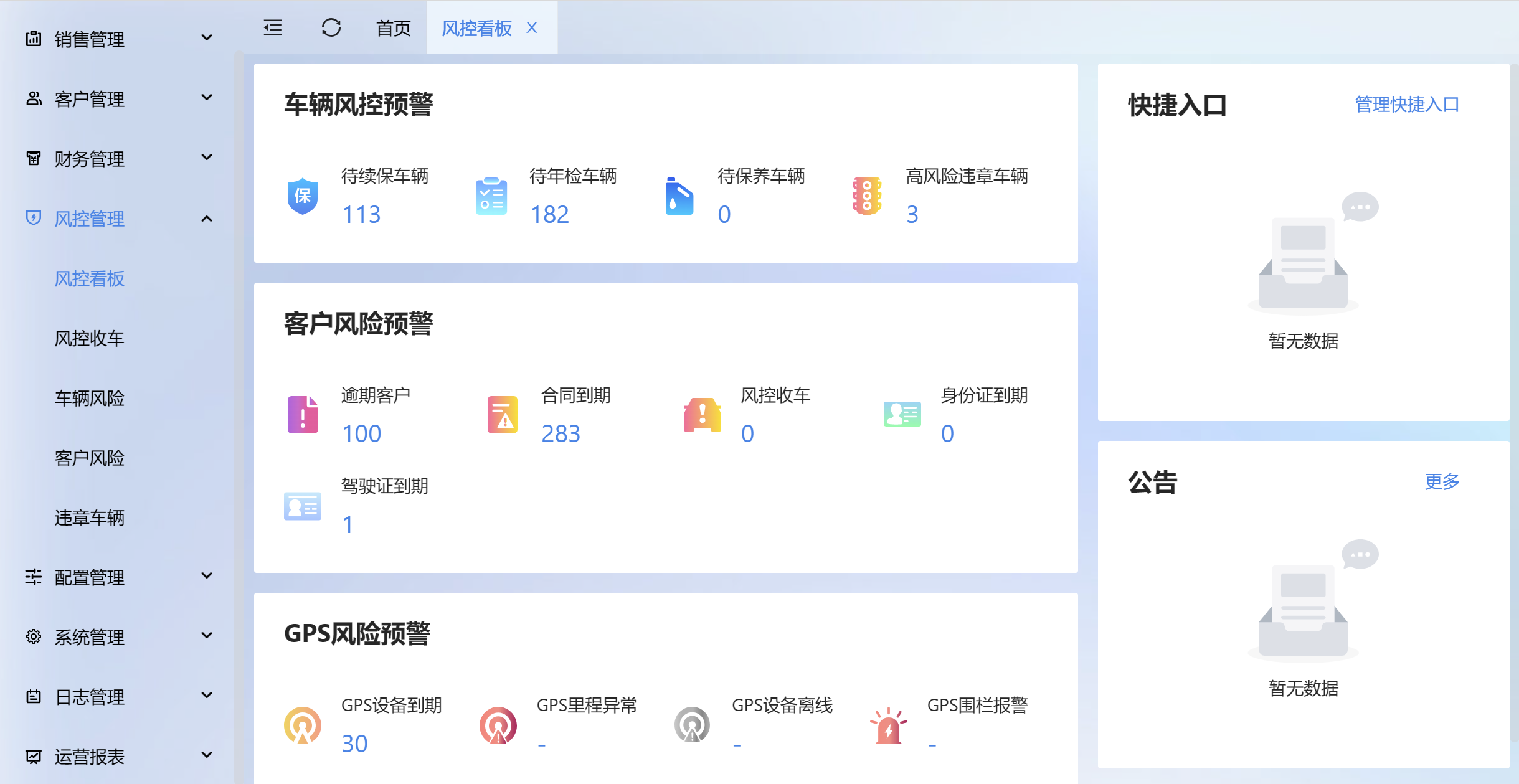风控看板可查看车辆、客户和GPS设备的风控概况和公告信息。